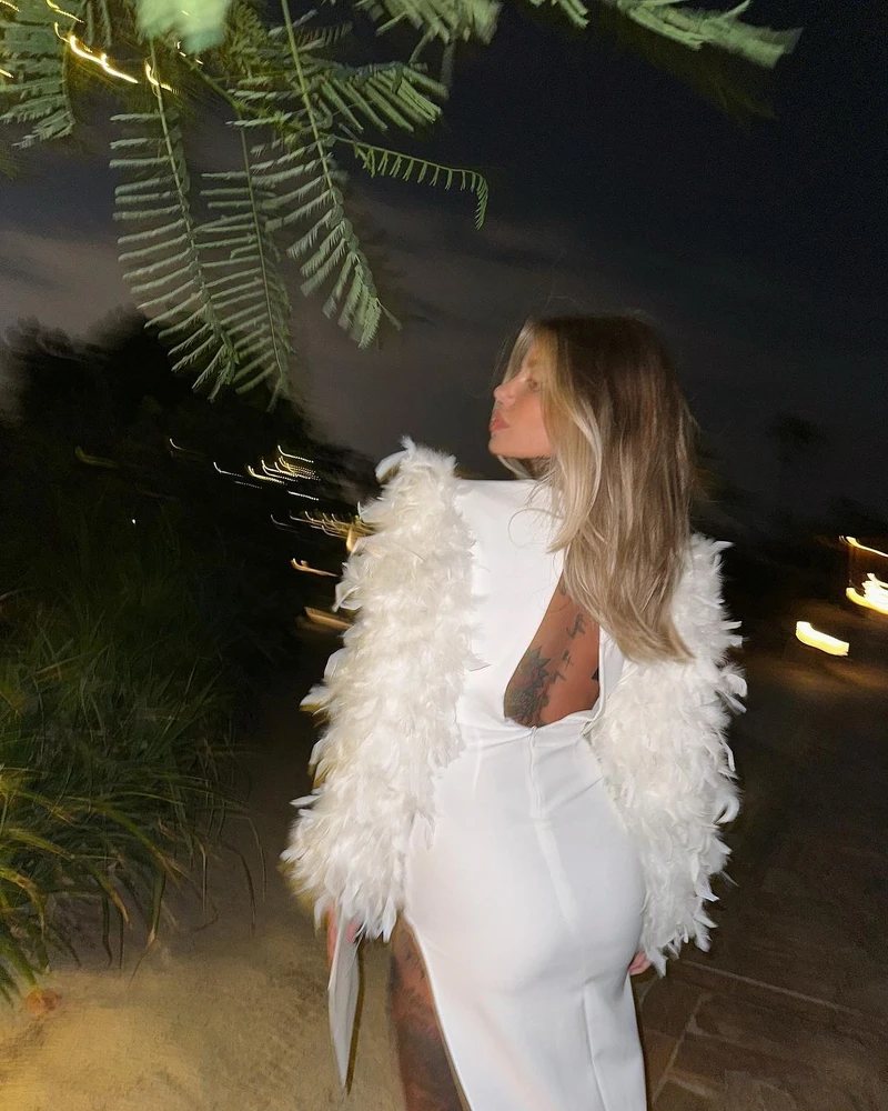 出席晚宴活動時,Zoe選擇一件羽毛不對稱禮服,超性感的深V剪裁、露出長的開衩設計,將她姣好的身材展露無遺。從這些你不難看出,Zoe平時作風火辣。