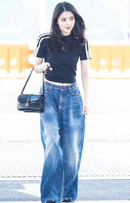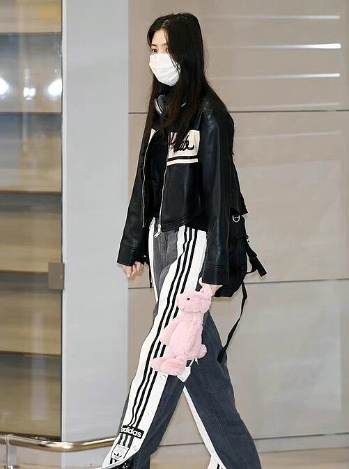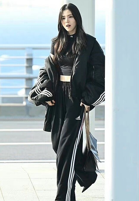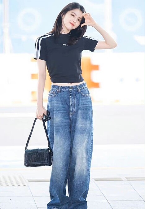 擔任巴黎世家品牌大使的她,從韓國仁川機場出境時,穿上Balenciaga X adidas聯名系列短版上衣,下半身選擇寬版牛仔褲作搭配,展現青春、率性的氣息。
