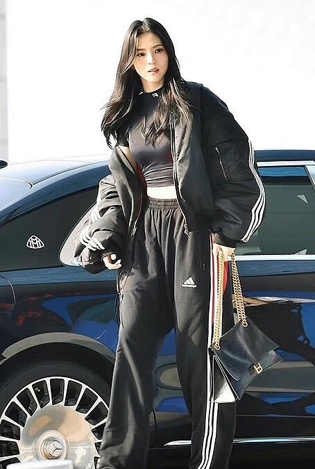 韓韶禧一甩甜美女神的形象,換上緊身上衣、運動長褲和寬鬆飛行外套,全身上下的黑色系搭配,就連手上的Balenciaga復古鍊帶包也是黑色款,化身暗黑系女神準備前往巴黎參加時裝週。
