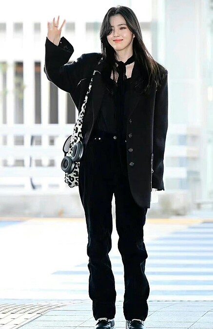 對於黑色的喜愛,又一次在機場時尚中展現,韓韶禧受邀參加2022AAA頒獎典禮,選擇黑色綁帶襯衫、牛仔長褲和Martin Kim獨特剪裁西裝外套現身機場,全身黑的造型更顯韓韶禧的膚色,而她身上的豹紋帆布袋還是宋慧喬的愛牌。