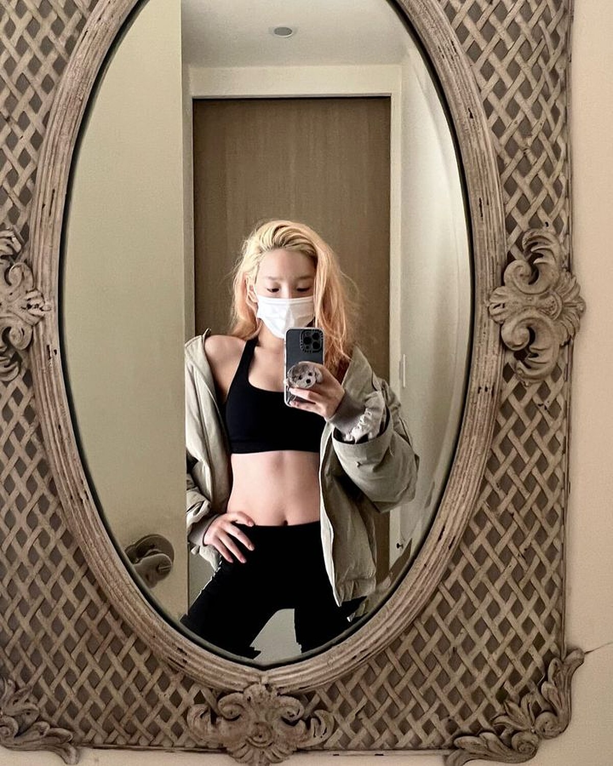 少女時代太妍則是把飛行員外套當作健身前後的保暖衣物,運動內衣+瑜珈褲組合,隨性地讓Bomber Jacket垂掛在肩膀,展現出不一樣的運動女孩性感魅力。