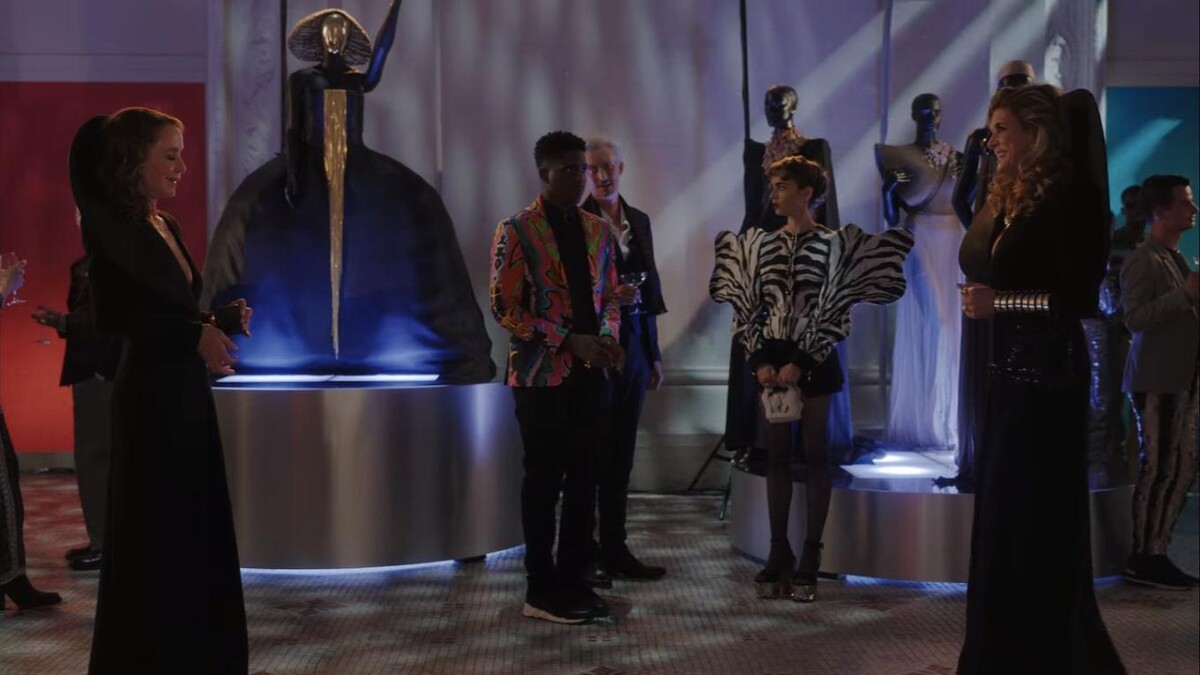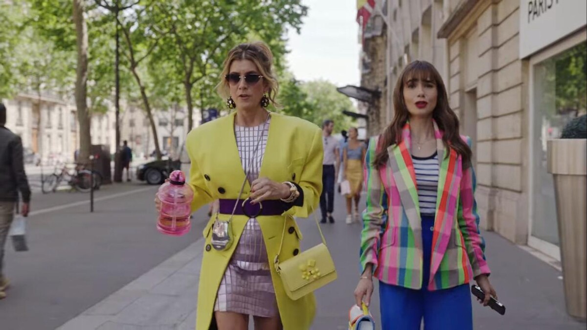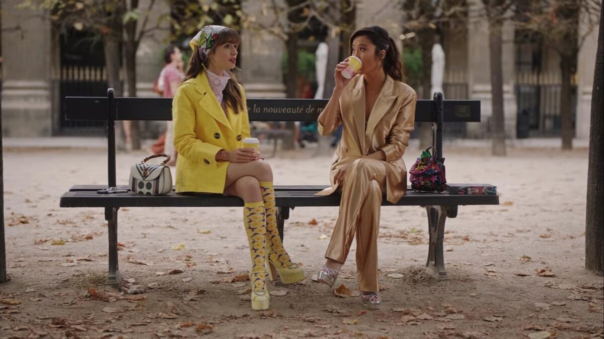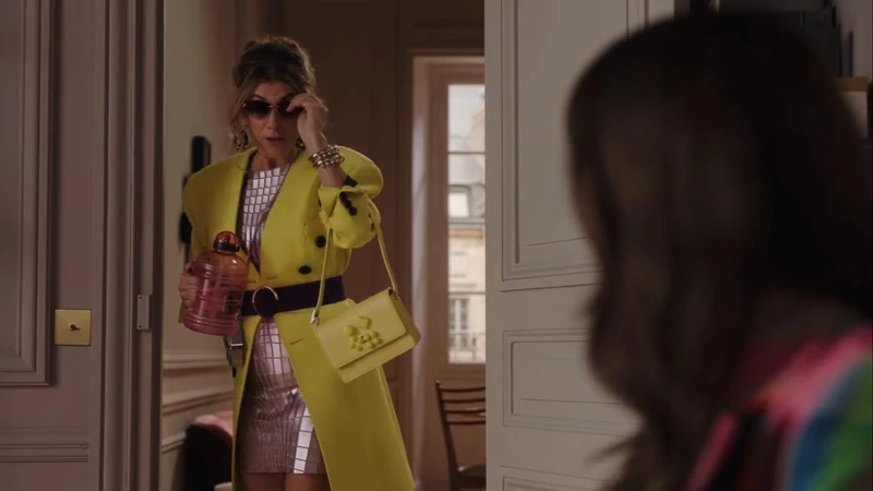 第一套可以看到 Emily 在芝加哥的主管 Madeline Wheeler 所使用的黃色包包搭配黃色大衣互相呼應,內搭亮片洋裝,讓造型多了華麗感。