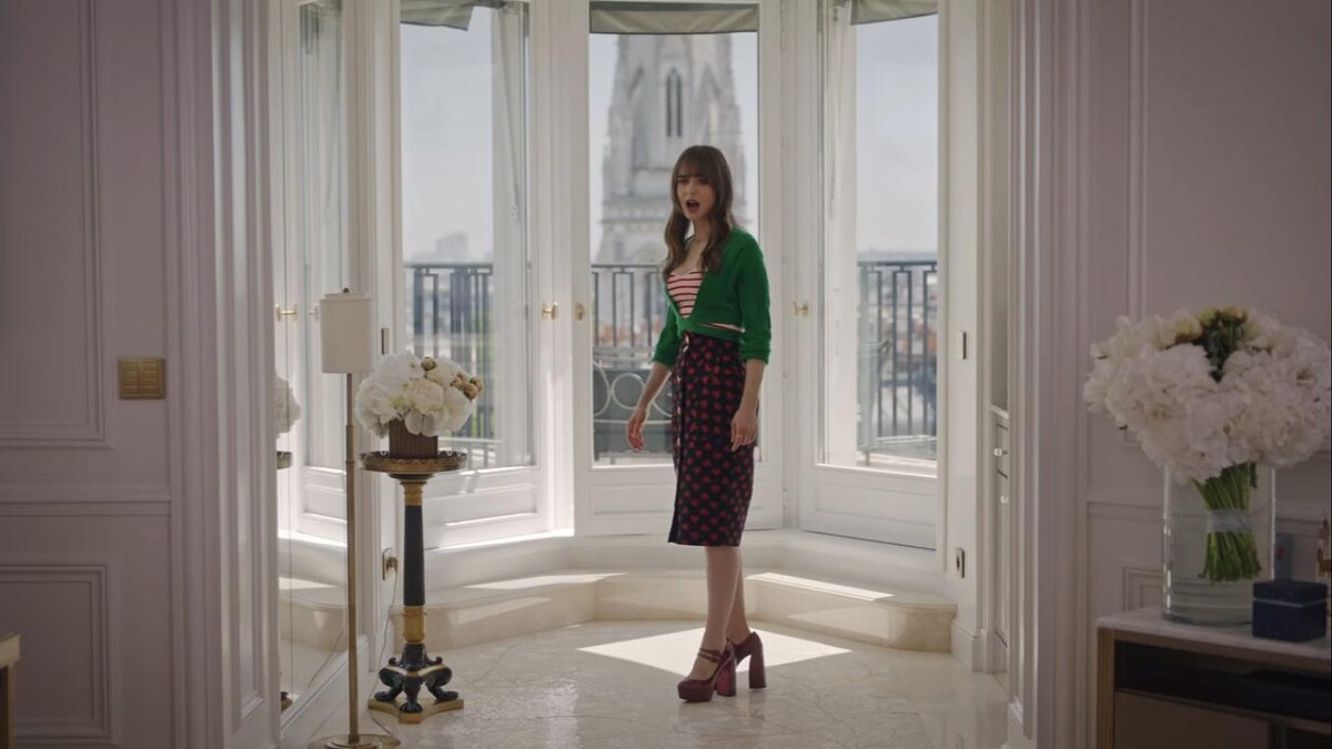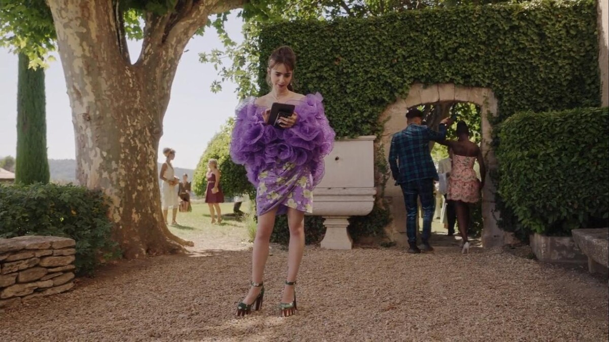 劇中一幕 Emily 前往普羅旺斯活動時穿著的 Yazefir 綠色拼接咖啡色厚底繫帶厚底鞋也是 Christan 與 Yaz Bukey 合作的鞋款作品,值得一提的是鞋面的圖案靈感來自土耳其桌遊 Clue。