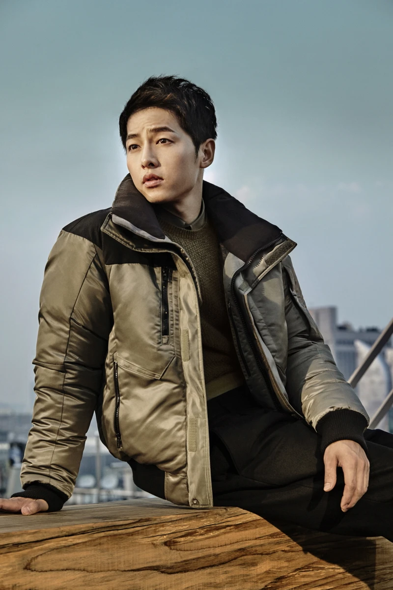 以軍綠色的羽絨衣,搭配同色系的針織毛衣,宋仲基展現出憂鬱小生的形象。