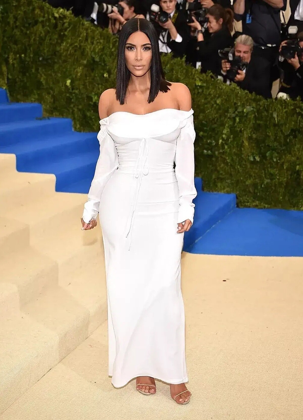 出席時尚奧斯卡Met Gala的金卡戴珊同樣是Vivienne Westwood的粉絲,這件白色平口長洋裝將她的姣好身材展露無遺。