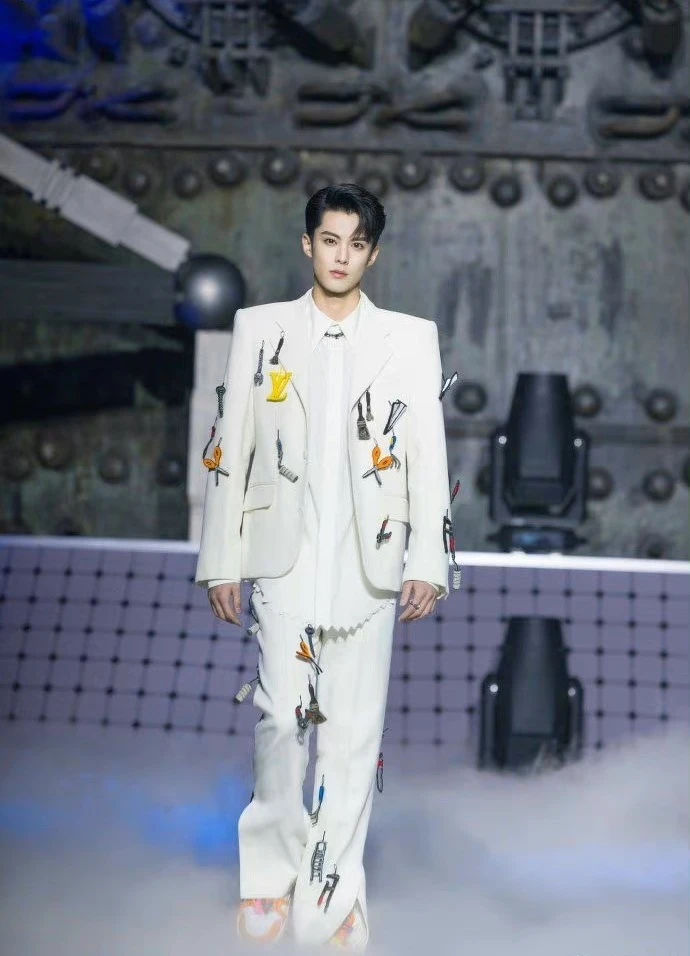 在Louis Vuitton台北101旗艦店開幕活動上,丁海寅選擇LV 2023春夏系列訂製款西裝亮相,白色襯衫、白色西裝外套加上白色西裝長褲,上頭綴以童趣的剪刀、紙飛機、螺絲起子…各種工具的刺繡串飾,為歐巴的白馬王子形象增添一絲俏皮感。