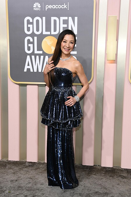 在第80屆金球獎典禮上,楊紫瓊一襲藍黑色的露肩禮服來自亞曼尼的高級訂製工坊Armani Privé,巧思在於臀間的小蛋糕裙設計,讓她結實的身材更有曼妙的性感線條,細緻的閃光加持,讓黑禮服從每個角度看都精彩。