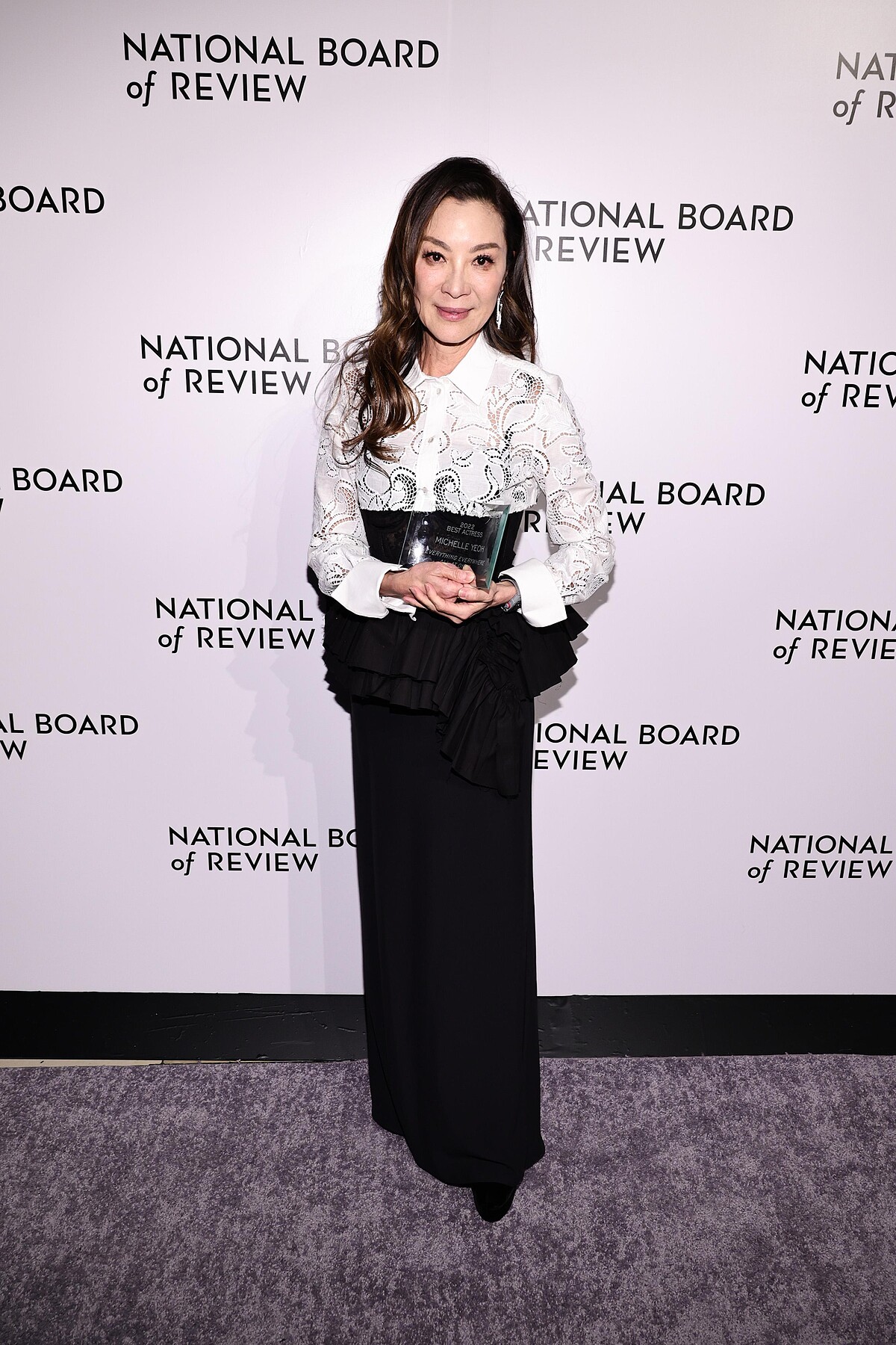 類似的小蛋糕裙版型,楊紫瓊在另一個National Board Of Review 2023 Awards Gala典禮場合上也穿過,換以蕾絲襯衫上衣與黑裙的搭配,別有知性韻味。