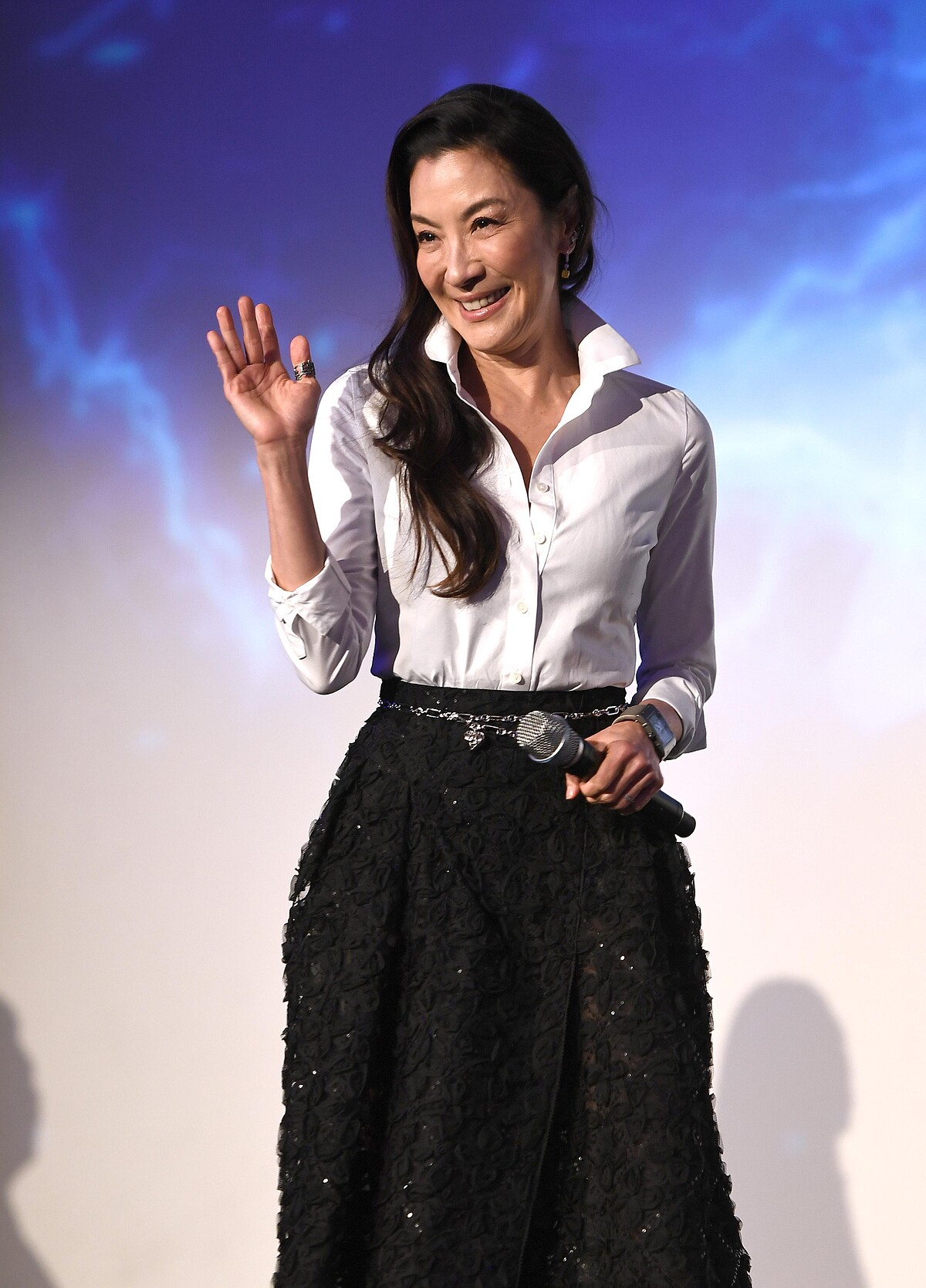 在2023奧斯卡入圍名單一出爐,不出所料,《媽的多重宇宙》一舉有11項獎項入圍!為慶祝影后豐碩的一年,位於比佛利師山莊的文華東方飯店為楊紫瓊舉辦了一場慶功晚宴,當晚以氣勢的全黑造型登場,也再次證實了她超群的黑白穿搭巧思。本回示範層次感的全黑造型:皮革襯衫版型硬挺又有個性,中間的鏤空細節拼接了一點點蕾絲,楊紫瓊便用一件蕾絲長裙與襯衫的蕾絲細節呼應,中間繫上一條寬腰帶打造出長腿比例。