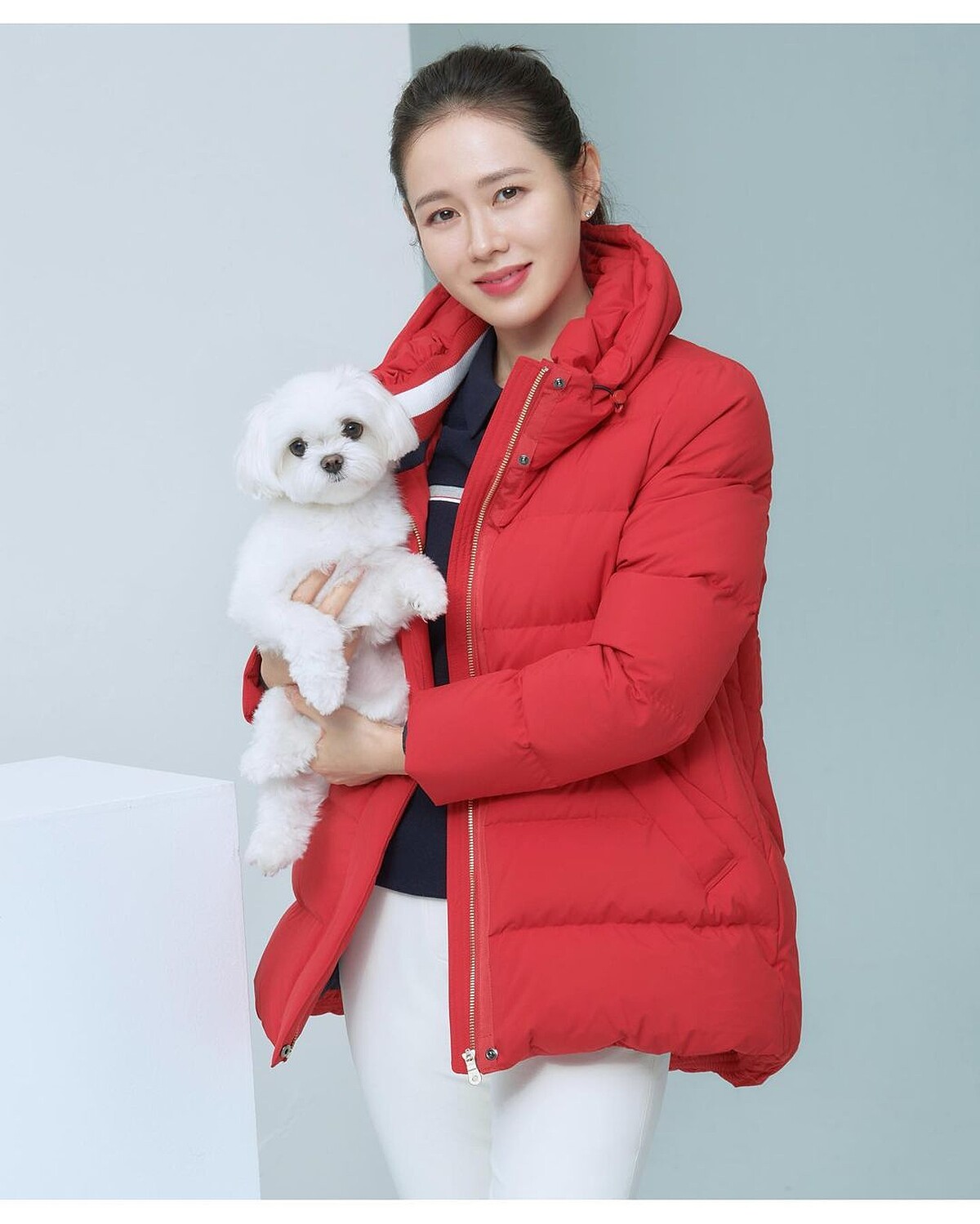 抱著愛犬的孫仙,以休閒風的海軍藍Polo衫配上白色長褲,外頭選擇一件鮮明的亮紅色羽絨衣與海軍藍上衣形成對比,相當應景即將到來的農曆新年。