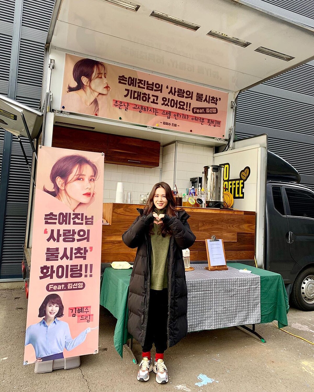 韓妞人人一件的長版羽絨衣,孫藝珍以芥末綠針織衫加上黑色休閒褲,與黑色長版羽絨衣搭配,特別之處,是歐膩腳上的紅色長襪,為整體穿搭增加亮點。
