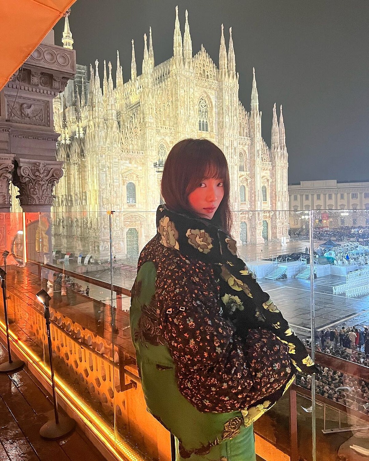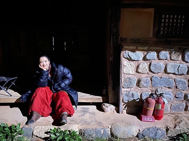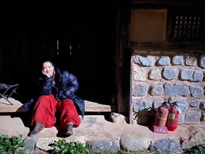 因韓劇《二十五,二十一》擄獲台灣粉絲的金泰梨,拍戲空擋為了禦寒,在戲服外罩上一件深藍色羽絨服,恰巧與紅色燈籠褲形成對比色,意外成為穿搭的亮點。
