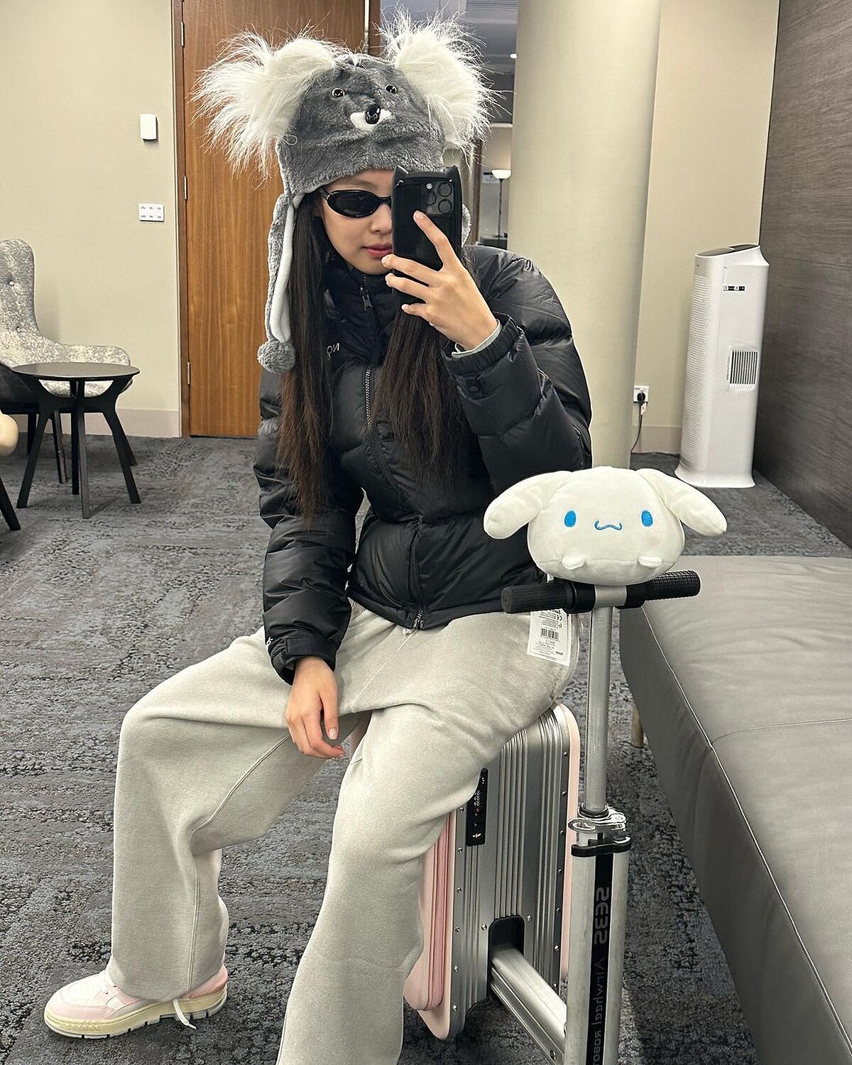 Jennie先前在演唱會上穿著基本款黑色羽絨衣登台,在後台時也為造型留下了照片,她僅是隨意的搭配了灰色的棉褲,即完成慵懶感十足的休閒造型。