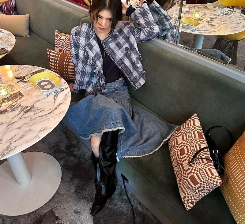 最新出現在韓韶禧Instagram的照片中,這件小香風的藍白格紋毛呢外套,則是歐膩先前代言的時尚品牌Lucky Chouette,品牌的甜美基因中帶點叛逆氣味,讓韓韶禧私下也常常搭配,從之前韓韶禧為Lucky Chouette拍攝的形象廣告不難看出,Lucky Chouette與歐膩的氣質相當合拍。