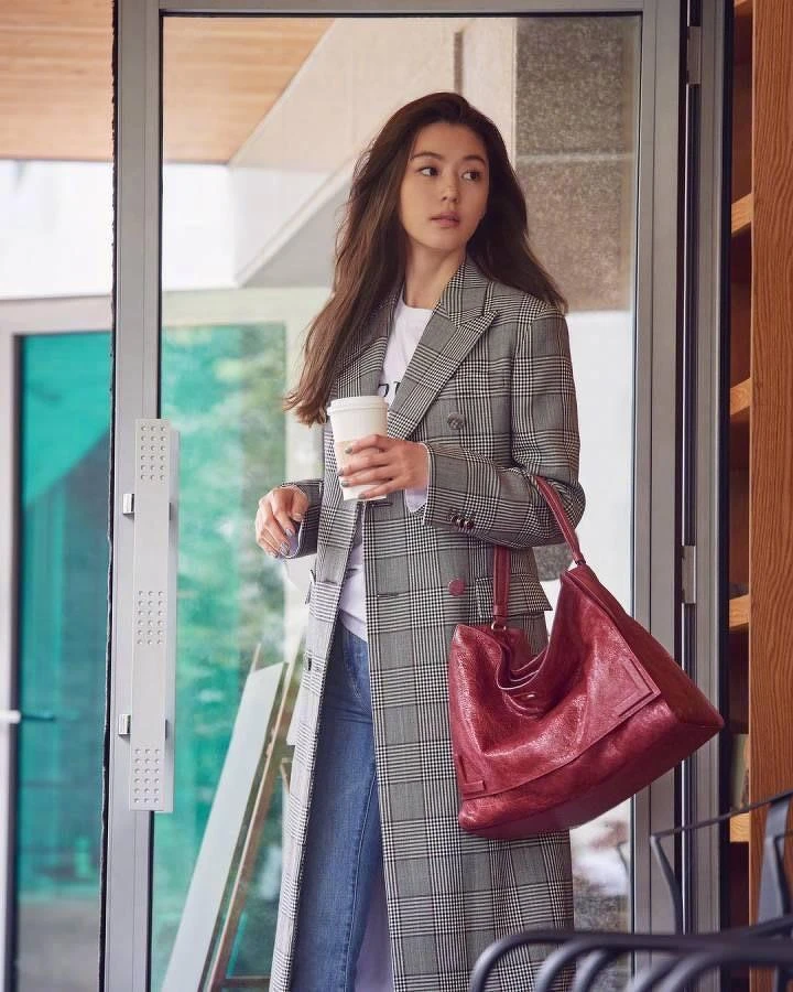 全智賢私底下外出時,也曾穿著濃濃英倫風的格紋風衣亮相,可以學習歐膩用配件點綴造型,讓穿搭更有型。