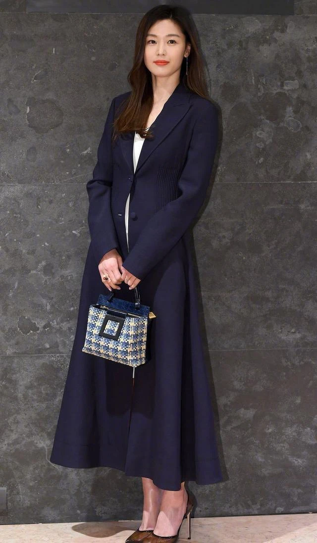 還有這套深藍色風衣洋裝,全智賢出席活動時,這身風衣穿搭展現出女神優雅、氣質的一面。