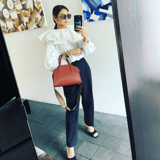 雖然滝沢眞規子多為素面穿搭,但她也時常以極具設計感的單品來讓穿搭更有趣,像這套雖然是常見的黑白配,褲子也僅是基本的西裝褲,但是上身襯衫的荷葉領、澎袖設計卻十足吸睛,沒有繁複搭配卻注目度滿滿,第二、三套也是同樣的道理,簡單讓穿搭變有趣!