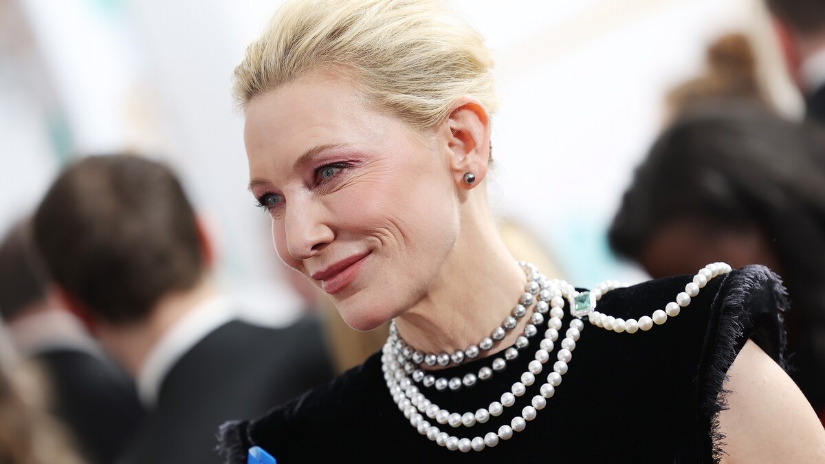 凱特布蘭琪配戴路易威登訂製「變更設計」的高級珠寶系列珍珠項鍊、珍珠耳環以及Stellar Times白金鑲鑽戒指,出席EE BAFTA Film Awards 2023英國電影學院獎頒獎典禮。