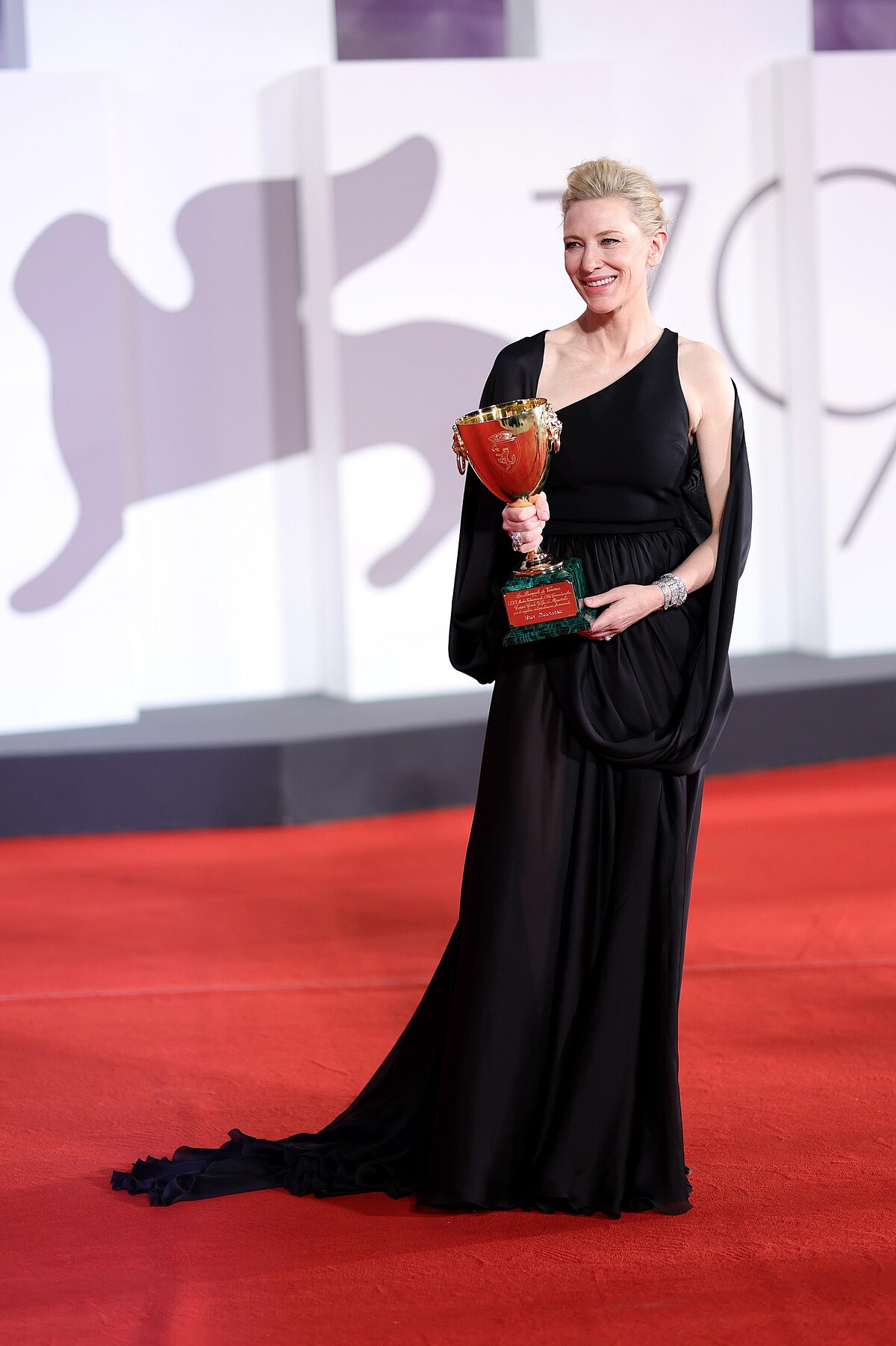 凱特布蘭琪穿上路易威登訂製黑色絲質披肩造型洋裝,配戴高級珠寶系列白金鑲鑽手鍊與耳環,出席第79屆威尼斯國際影展Venice International Film Festival紅毯,並以電影《Tár》獲頒最佳女演員獎。