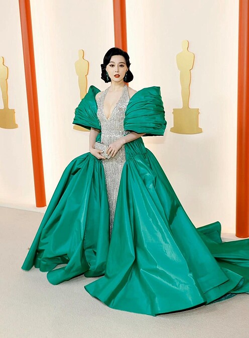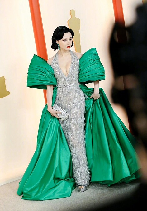 睽違10年,范冰冰再度登上奧斯卡頒獎典禮,范爺選擇Tony Ward打造的銀色亮片流蘇拼接祖母綠緞面禮服出席,這身浮誇又華麗的造型,算是為范冰冰重返影壇奠定一個新的開始。