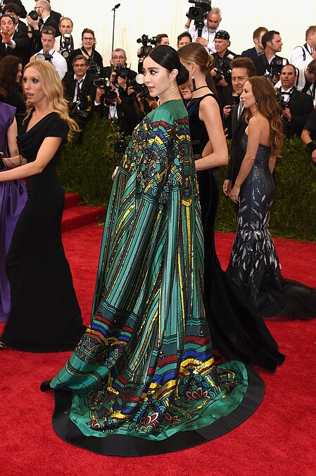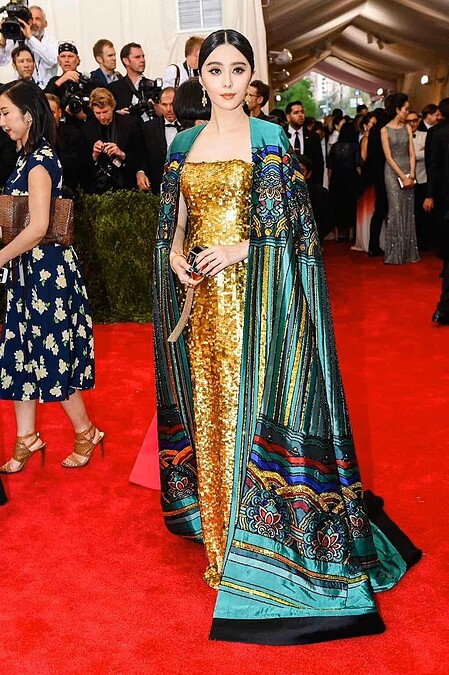 有時尚奧斯卡之稱的Met Gala,范冰冰曾以一襲金色亮片禮服,搭配東方風刺繡長袍出席,宛如她在宮廷劇《武媚娘傳奇》中的女王形象,也是她相當具代表性的紅毯造型之一。