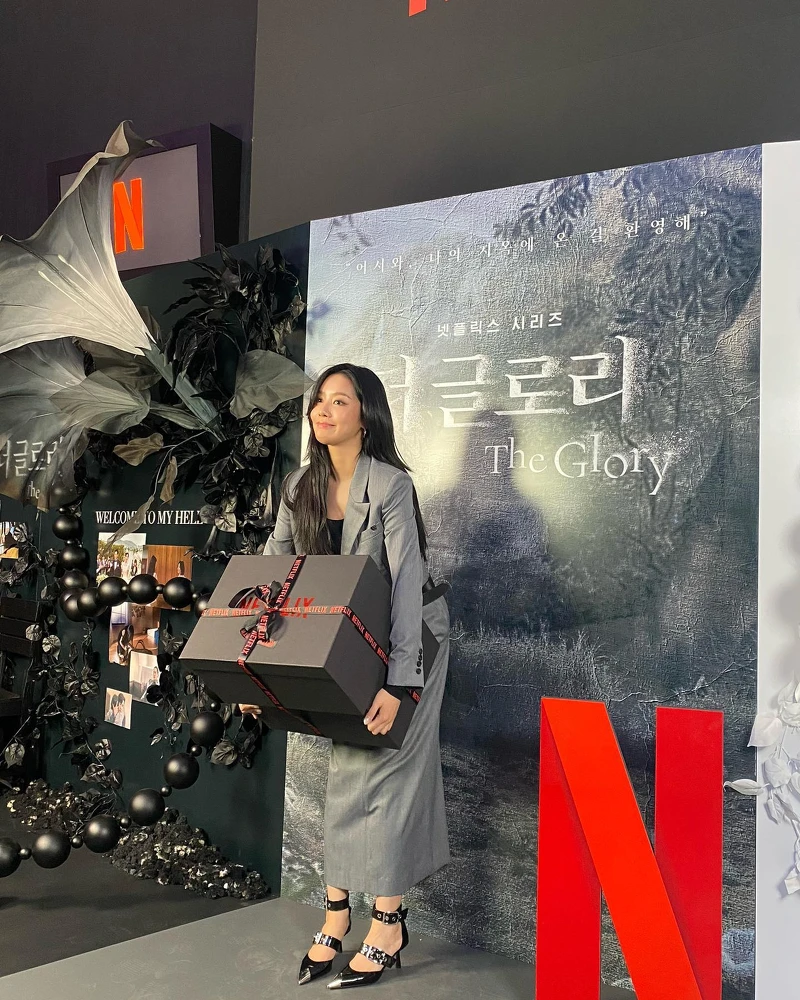 而另一套驚艷穿搭,是在《黑暗榮耀》的記者會上,車珠英身穿一套俐落的西裝,短版的外套搭配上高腰長裙,本來就170公分多的她看起來更為修長;配上一雙尖頭綁帶的黑色跟鞋,演繹冰山美人氣質。