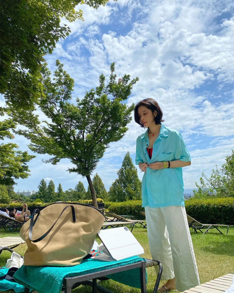 另一示範,車珠英以寬版襯衫搭配白色寬褲,不強調身形曲線,反而有種脫俗的率性感,以跳色的的飾品點綴,更顯出她活潑的穿搭個性。