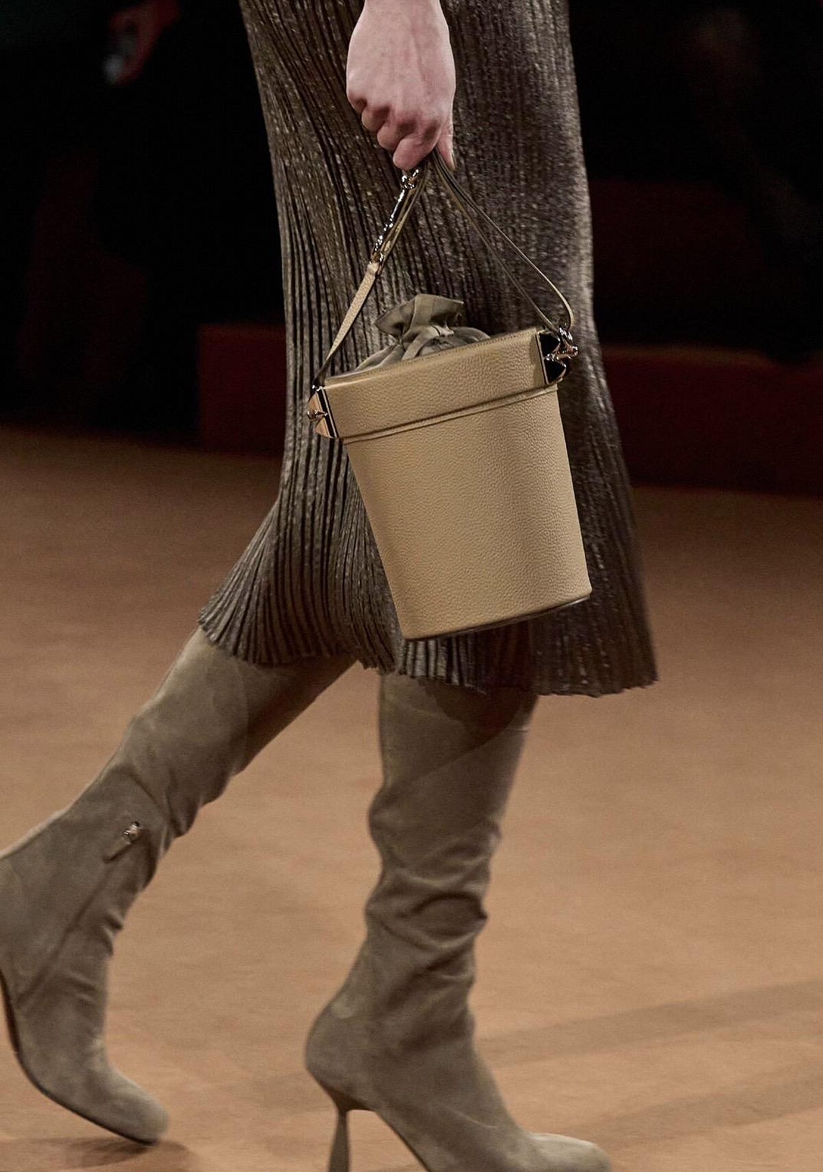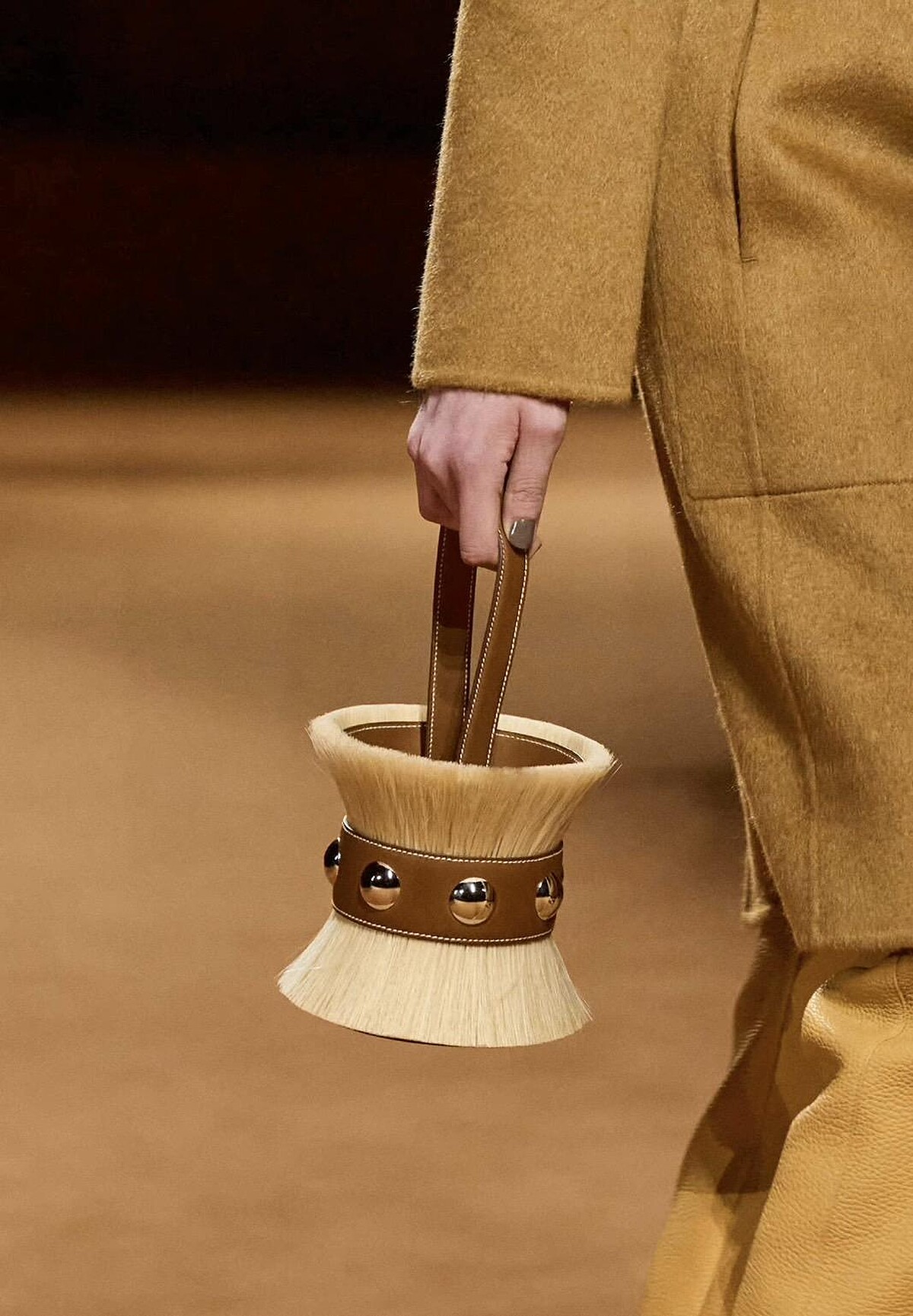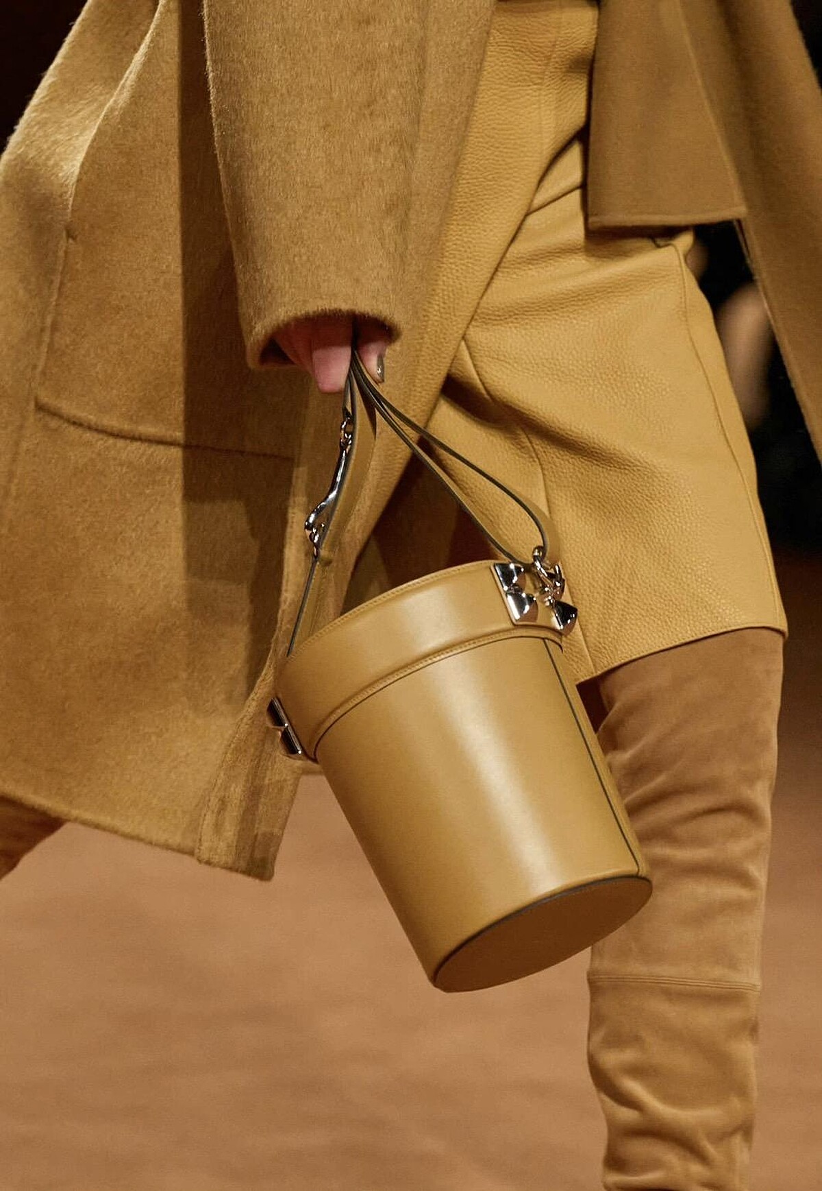 延續品牌的馬術精神和皮革工藝,將皮革面料與質感麂皮拼接,打造出硬挺的圓筒包。