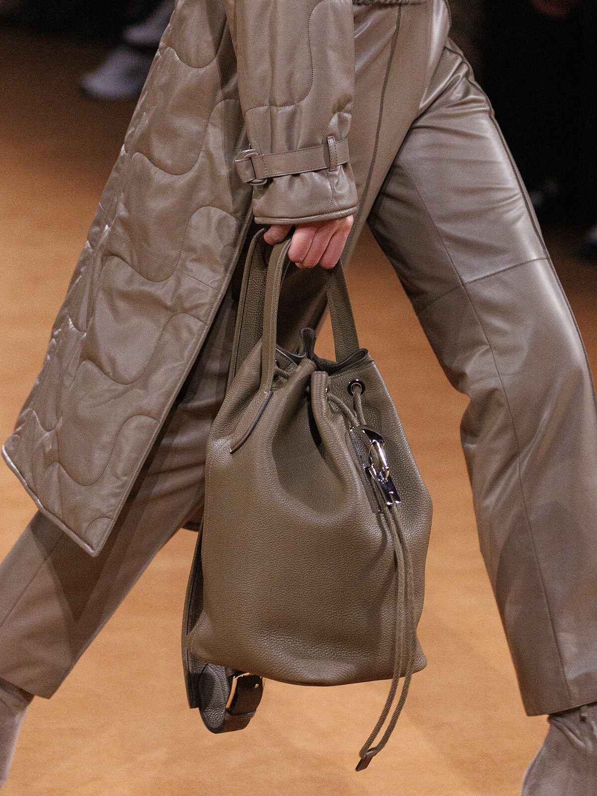 以柔軟的皮革面料,結合抽繩束口設計,推出可以手提亦可以肩背的束口包,包括深棕色、淺褐色等。