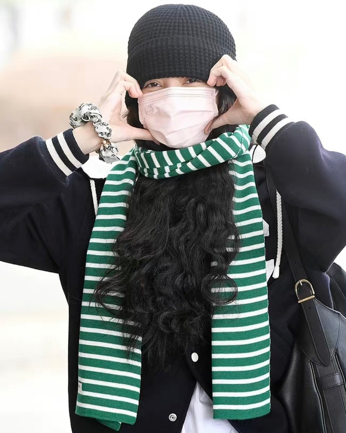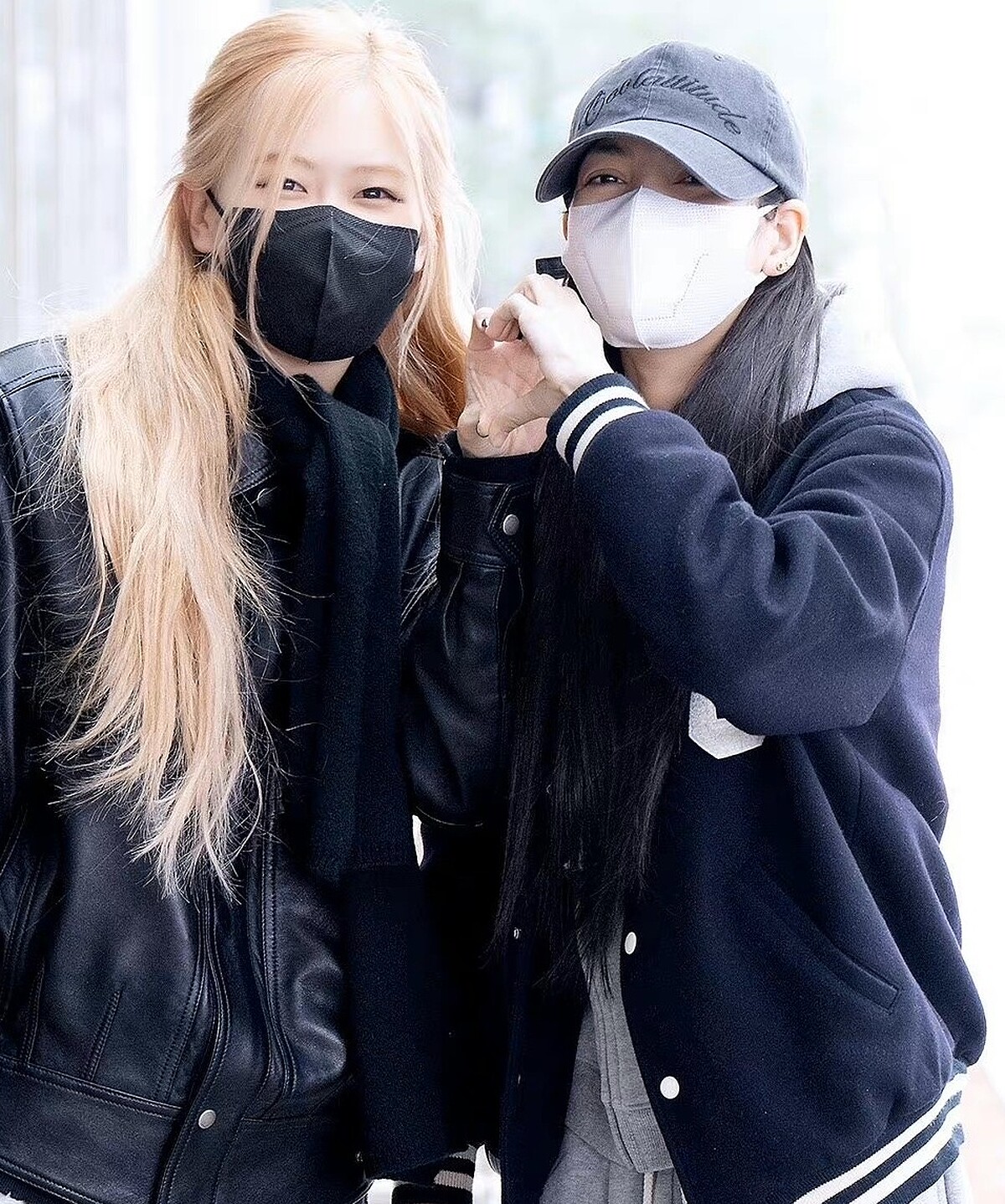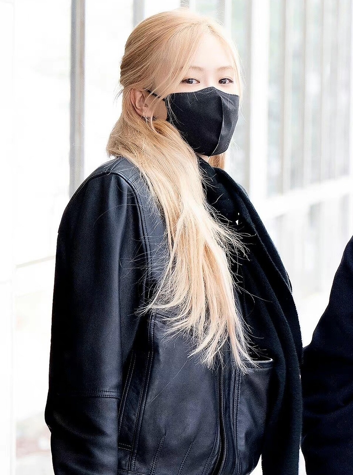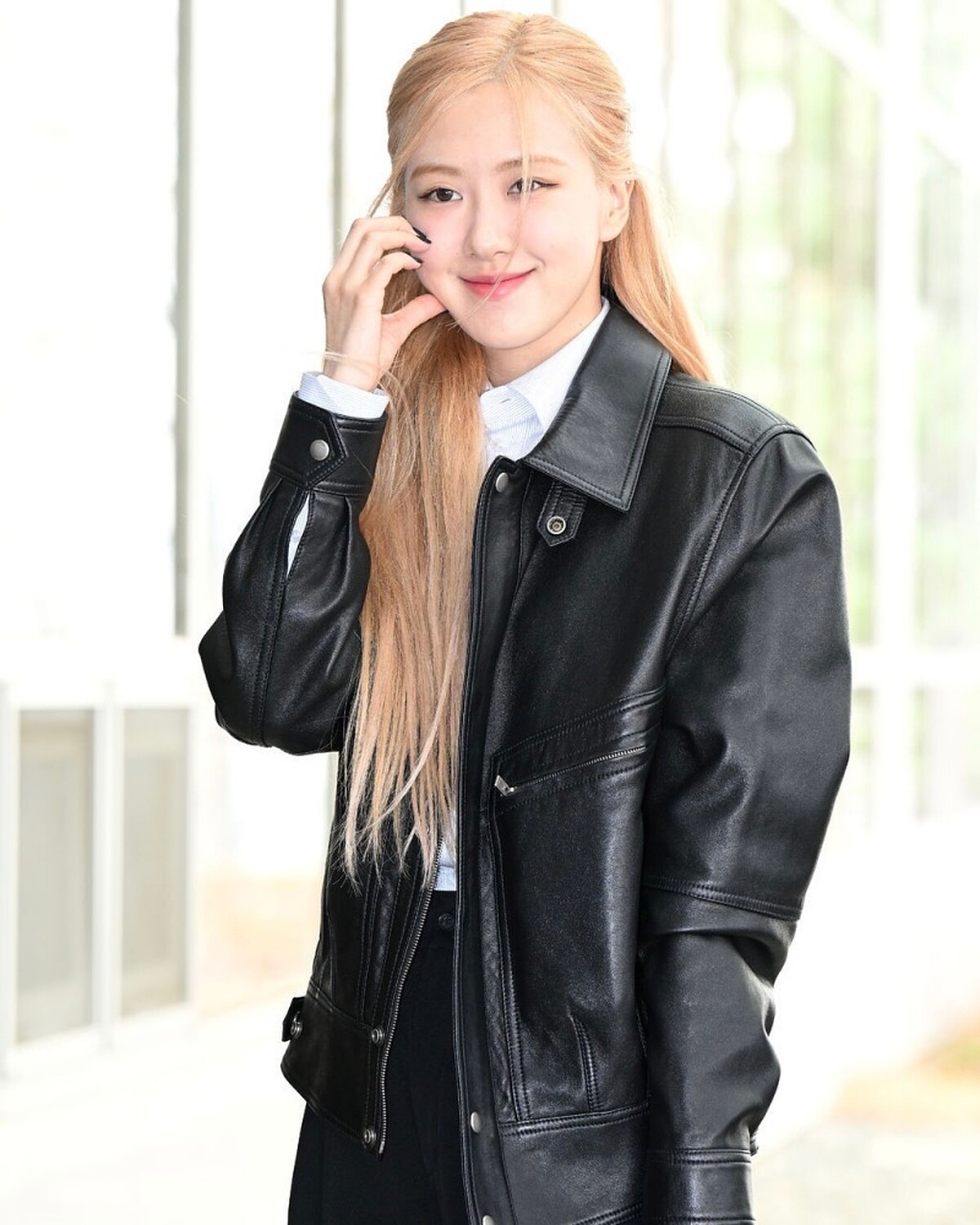 帥氣女神Rosé以藍白條紋襯衫、黑色長褲再套上一件皮革外套亮相,加上她的招牌金髮美到不行。
