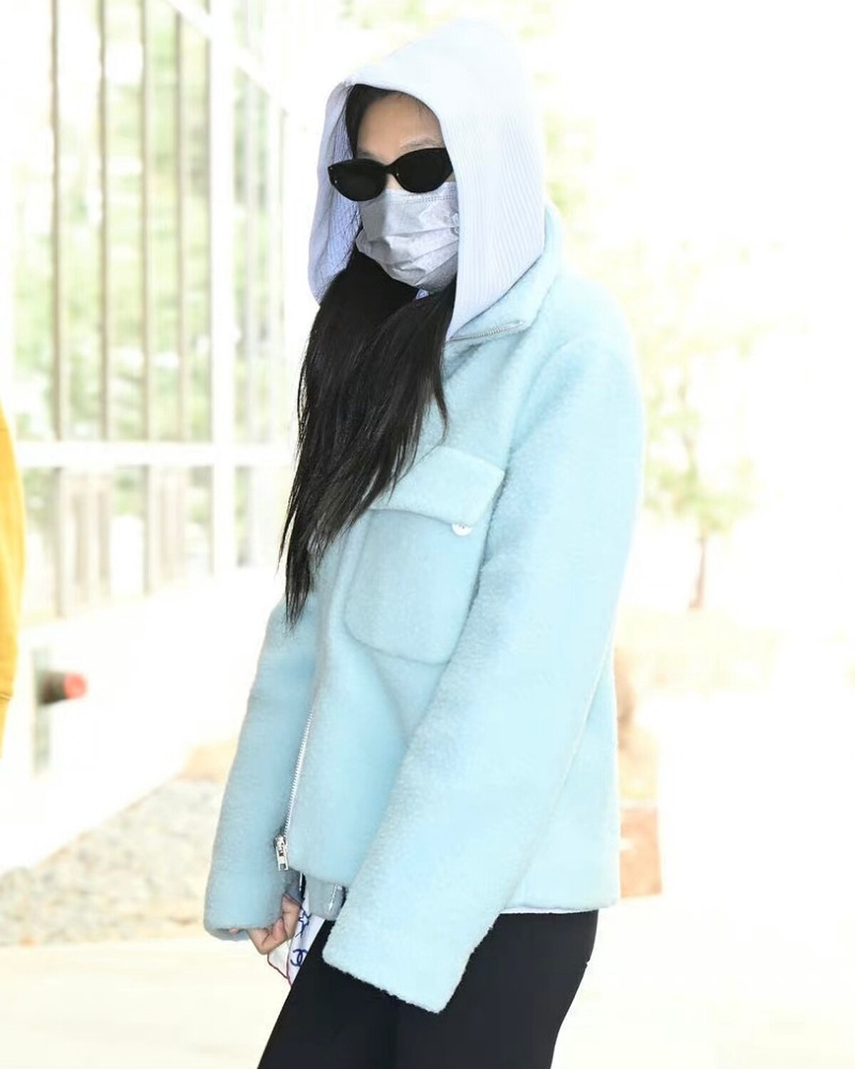 Jennie身上這件Helmut Lang湖水藍外套超搶眼,背著香奈兒黑色菱格紋口蓋包,腳上則是adidas Originals和菲董聯名球鞋。