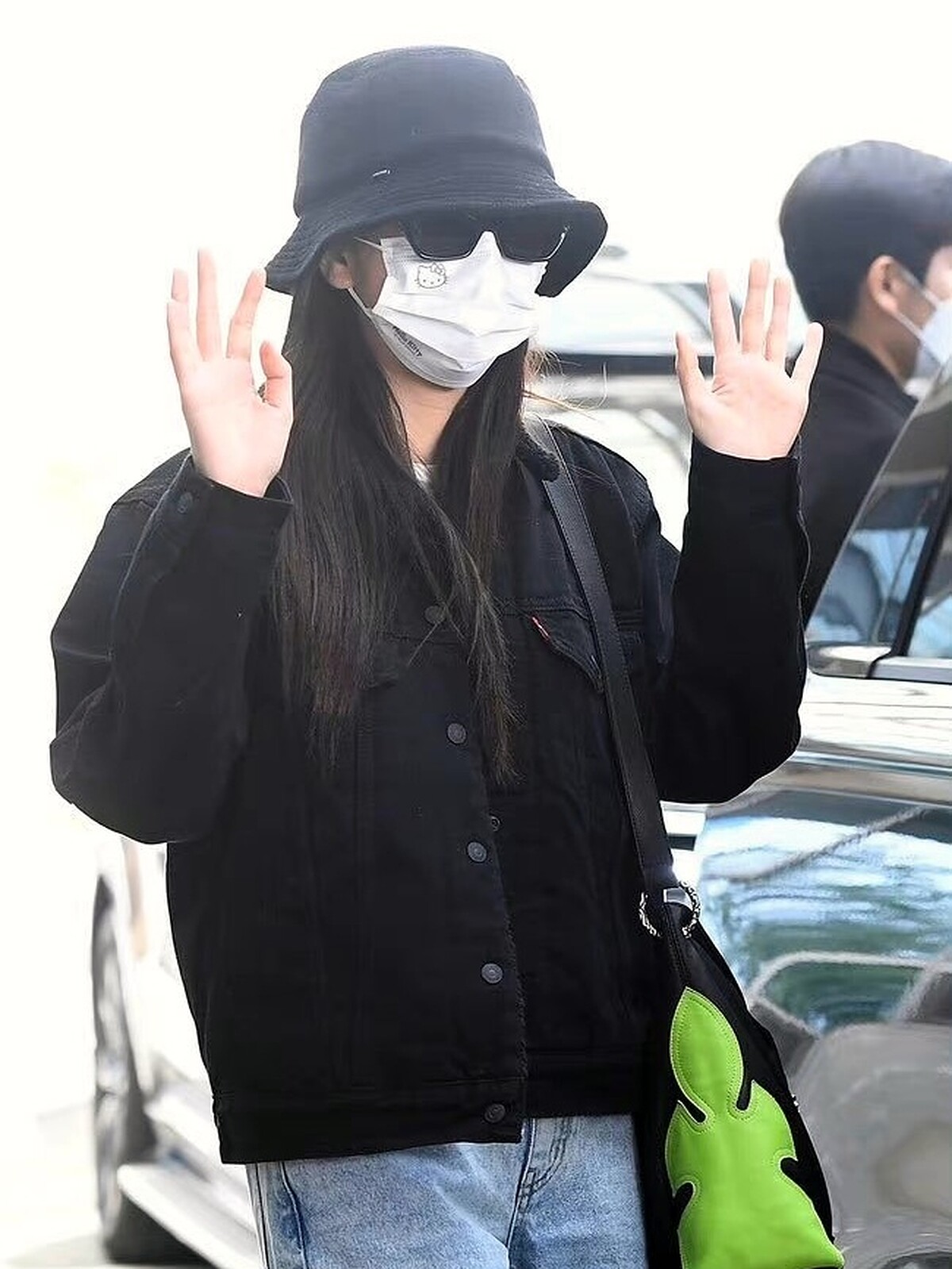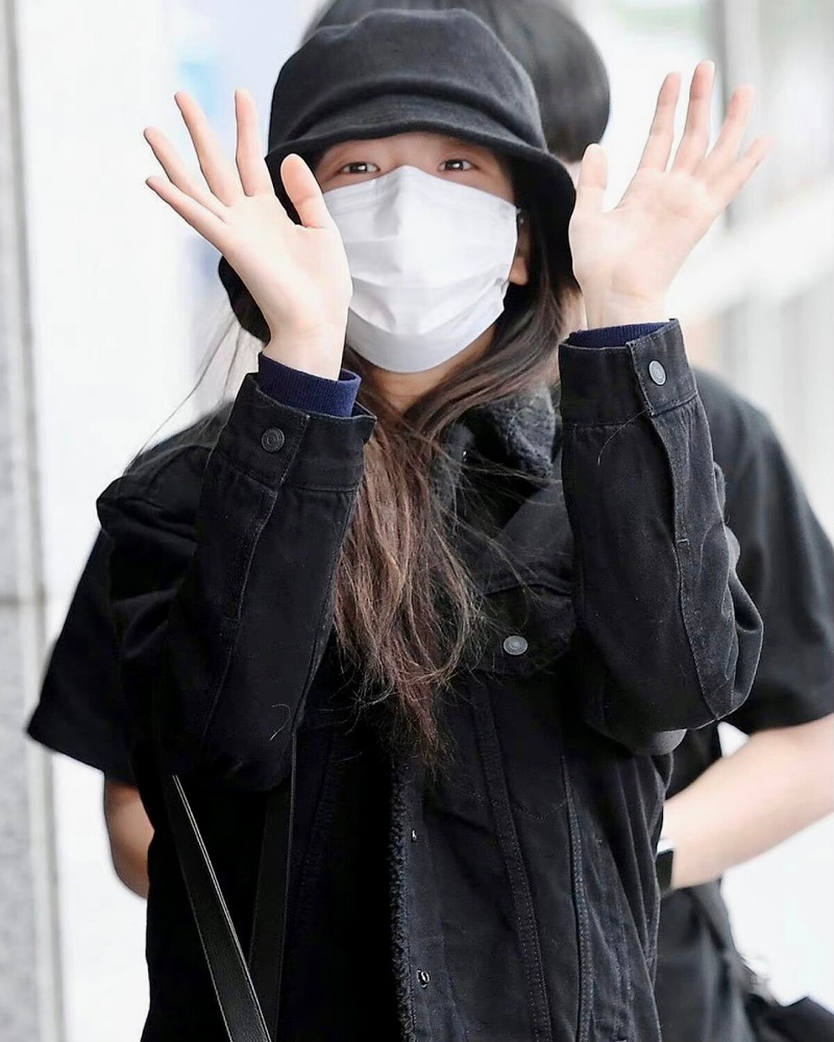 Jisoo選擇以零失誤的黑色穿搭現身,黑色外套、黑色長褲再配上黑色漁夫帽,讓腳上Dior老花帆布鞋成為整個造型的亮點。