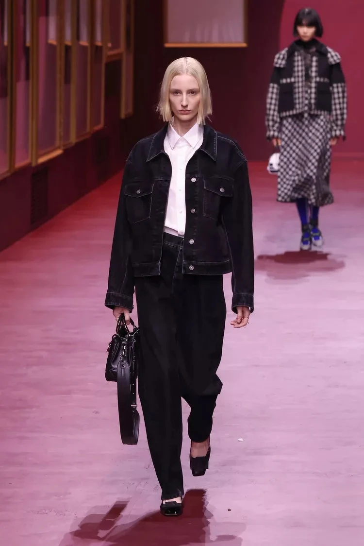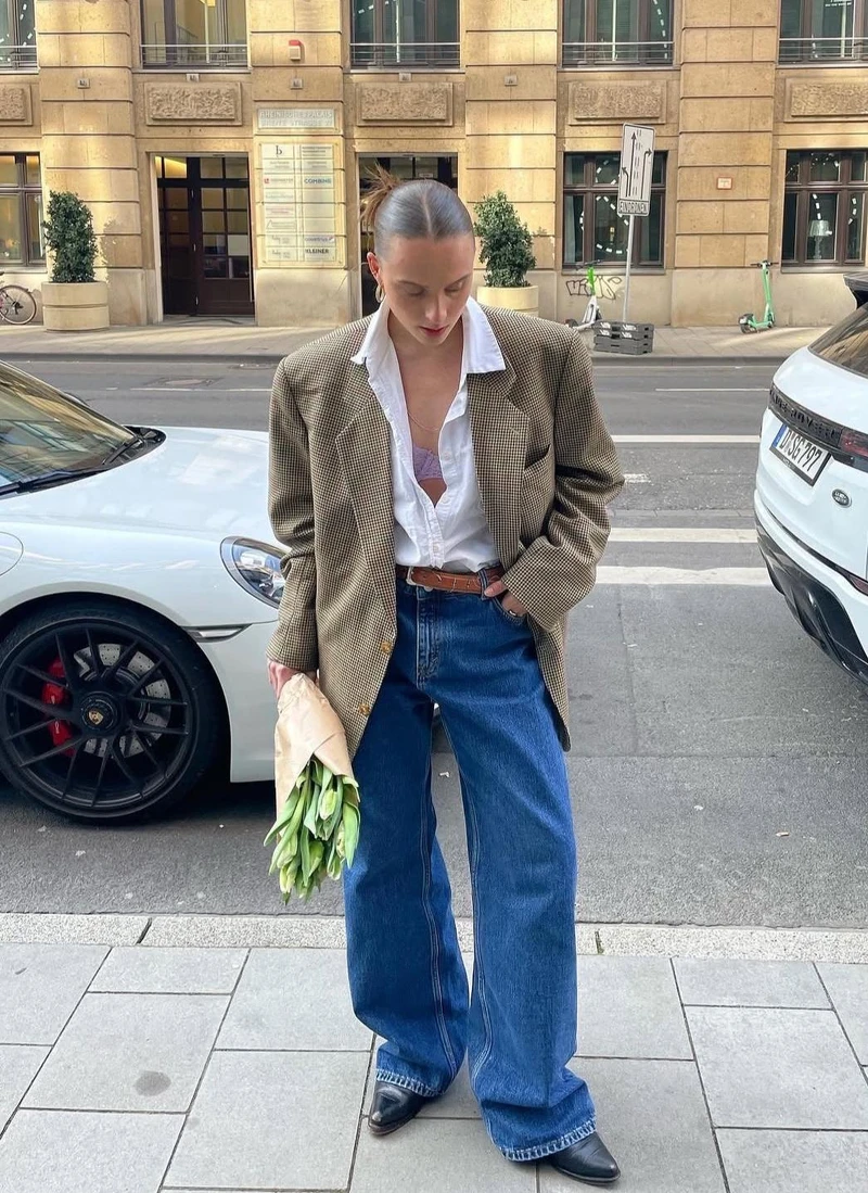 寬鬆上身/外衣+繭型牛仔褲+鞋身較窄的鞋款