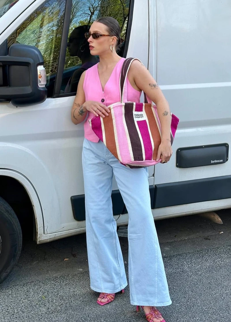 闊腿牛仔褲既能性感緊身、率性合身、也能創造慵懶寬鬆感,屬於自成一類的變化版牛仔褲型;因此,建議所有褲型的穿搭原則,都應符合「上窄下寬」重點,避免整體看起來太過臃腫;個子嬌小的女生,則建議選擇高跟鞋、高跟短靴等配件造型,延伸下半身比例。可以看到美劇《河谷鎮》女演員 Camila Mendes 選用偏高腰、工裝設計款的闊腿牛仔褲,搭配短版小可愛造型,以凸顯腰身線條的優勢與修長比例。