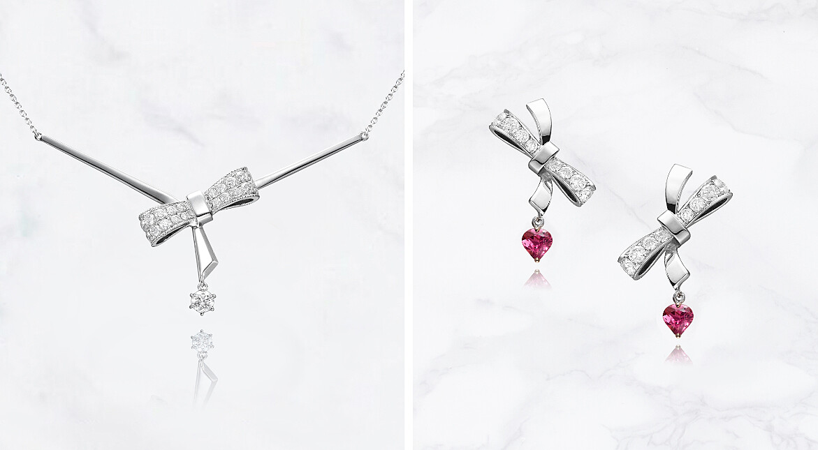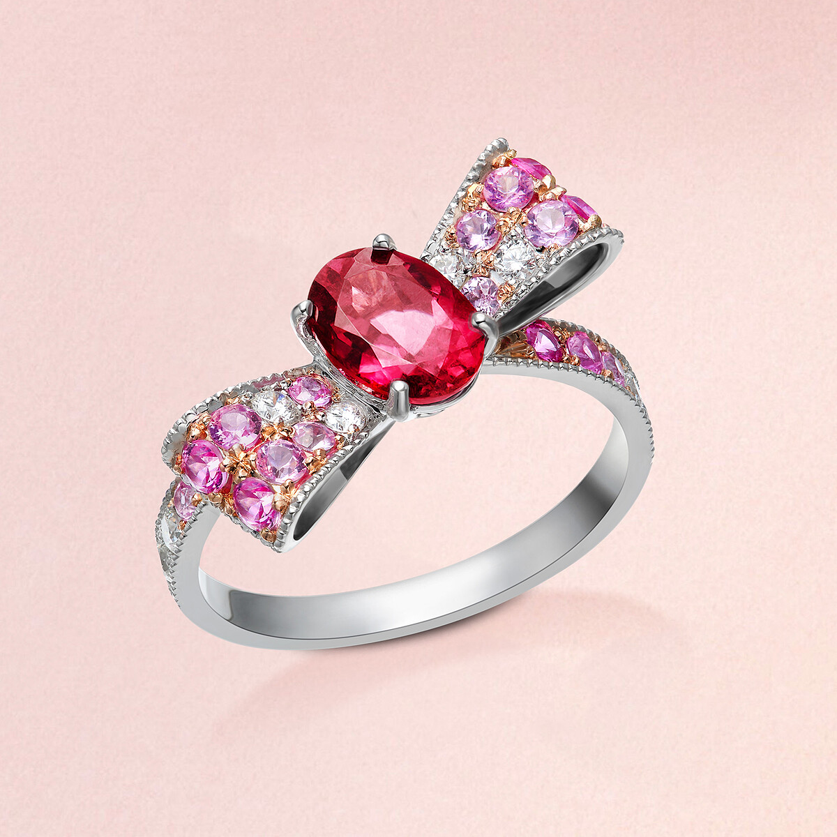 為了映襯出每位女性的不同溫柔樣貌,「小公主」系列特別推出粉色蝴蝶結新品,打造出浪漫甜蜜更夢幻的獨有風格,以璀璨鑽石與粉紅彩寶的交錯搭配,呈現出柔和閃爍的漸層效果,蝴蝶結中央則鑲嵌著紅寶碧璽,以緋紅絕美的光澤代表女孩心中永存的那顆柔軟真心,虹彩光芒隨著舉手投足閃耀在指間,令人心動不已。