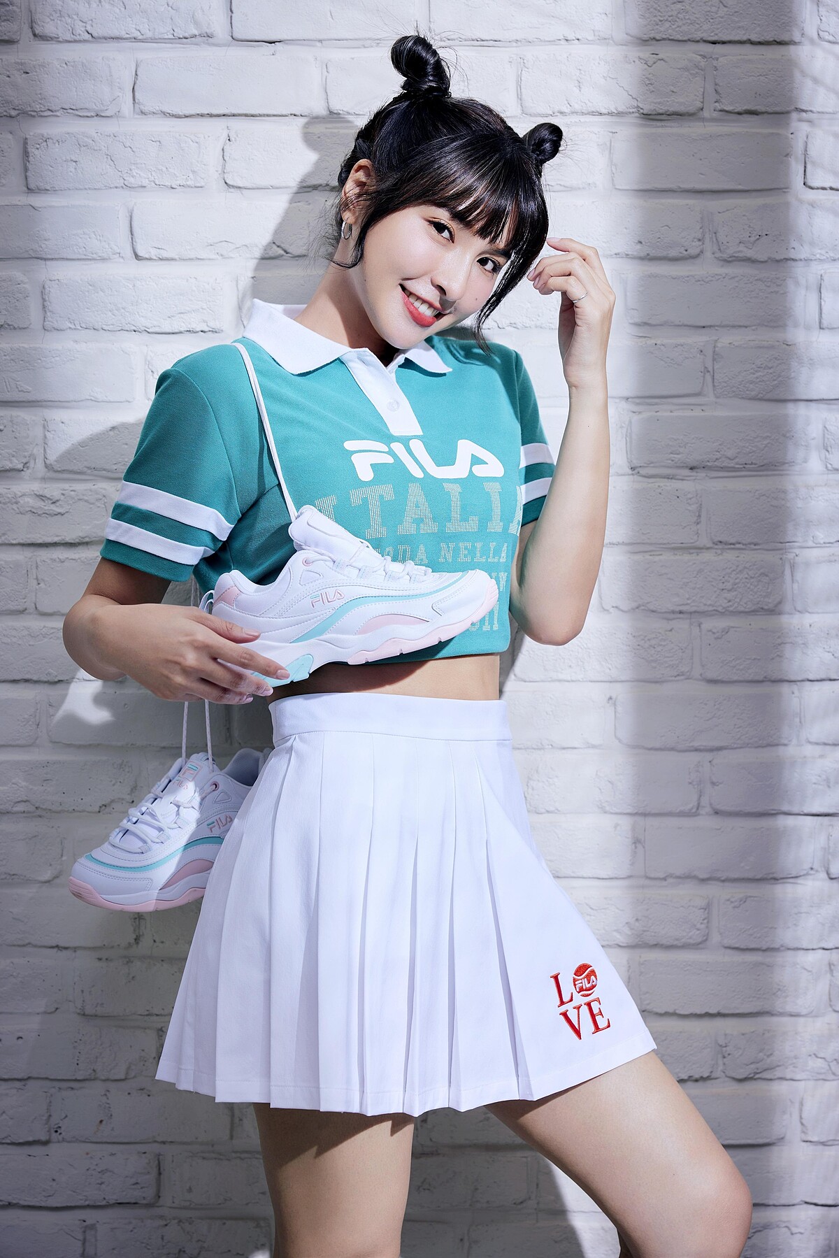 甜美又充滿陽光氣息的峮峮,與國際品牌FILA具有明亮且時髦的運動潮流風格不謀而合,身為FILA品牌代言人的峮峮則發揮她專屬的”峮式風格”穿搭,穿上Pantone2023春夏代表色銅綠(Verdigris)的FILA 1911字樣的POLO上衣,搭上LOVE及網球圖案刺繡的白色百摺短裙,整體散發清爽且滿滿80年代復古潮流感,腳踩韓妞最愛的FILA RAY老爹鞋,而且還是全球唯一台灣獨家限定發行2023年紀念款老爹鞋,純白鞋身搭配清涼薄荷綠搭配櫻花粉色調,超適合日常休閒與運動混搭的時尚風格。