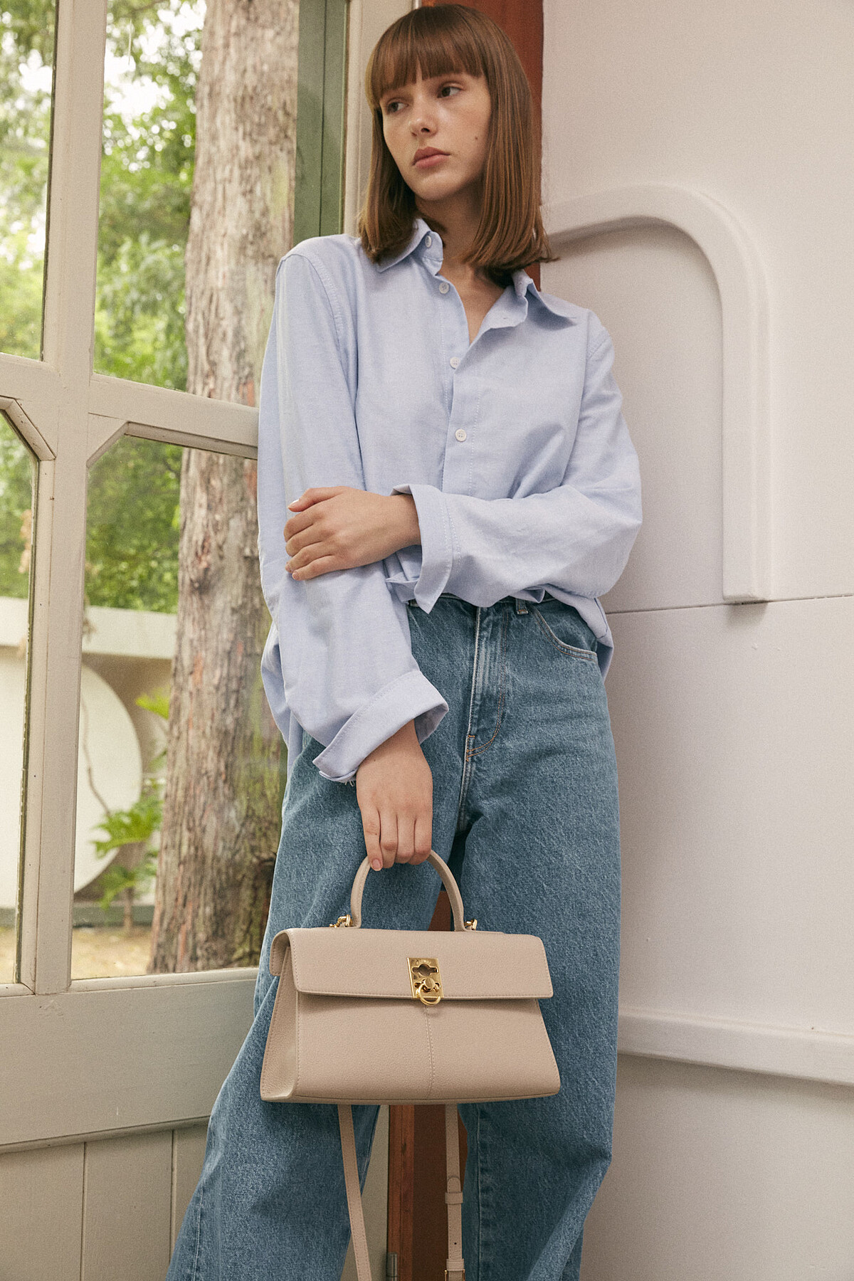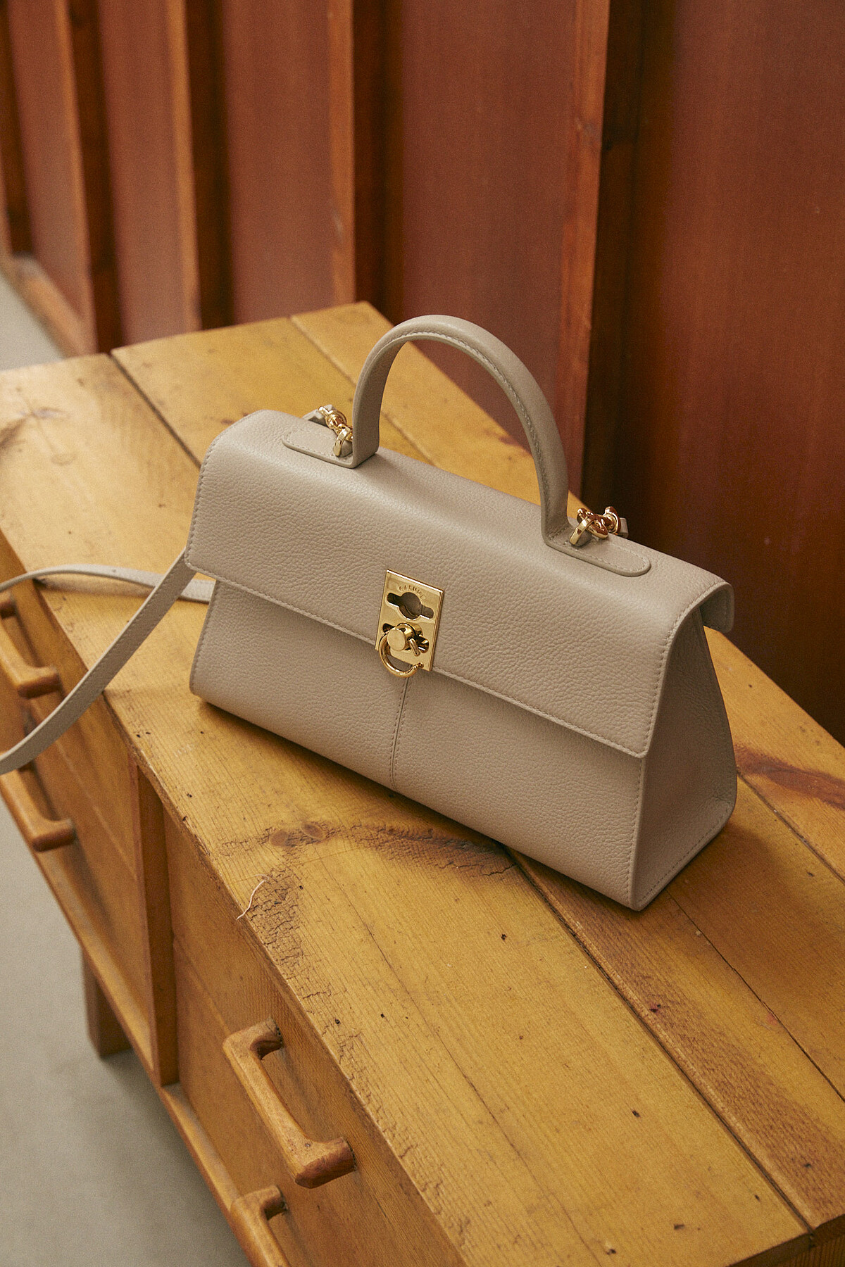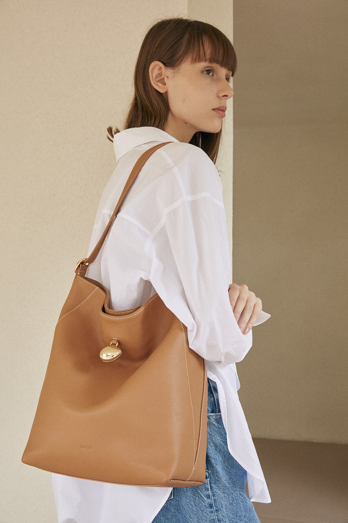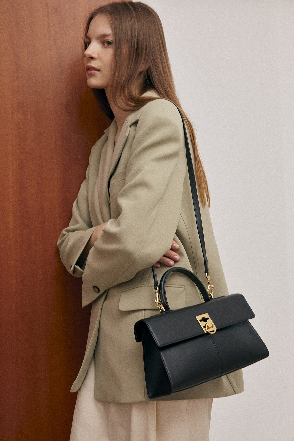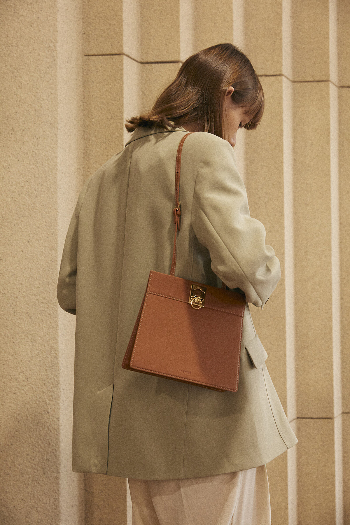 Clasp Bag 則是結合金屬框架的皮製手袋,靈感源自1880年代的包袋歷史,復古的經典樣貌揉合現代細節,側邊看來有著三角輪廓,設計師受到植物的根莖啟發創作出可調節幼肩帶,搭配標誌性的C-Lock配件,典雅中洋溢當代氛圍。