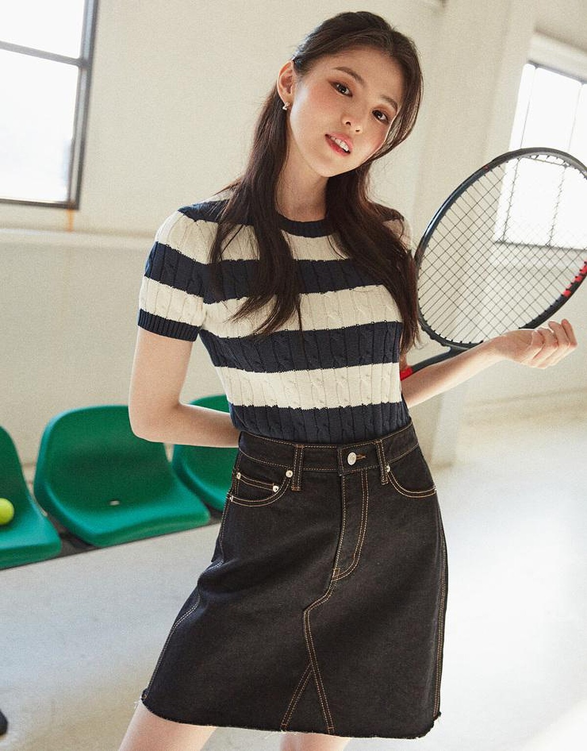 一直都穿牛仔褲,今年夏天換換看青春感的牛仔短裙吧!韓韶禧以貼身的條紋針織衣搭配,挽起氣質的公主頭髮型,整體感覺宛如青春的女大生。