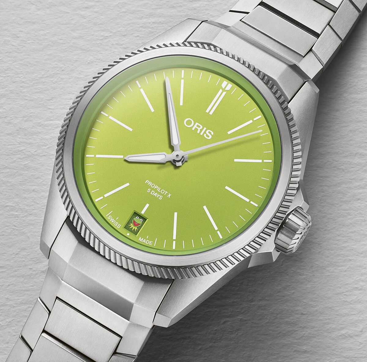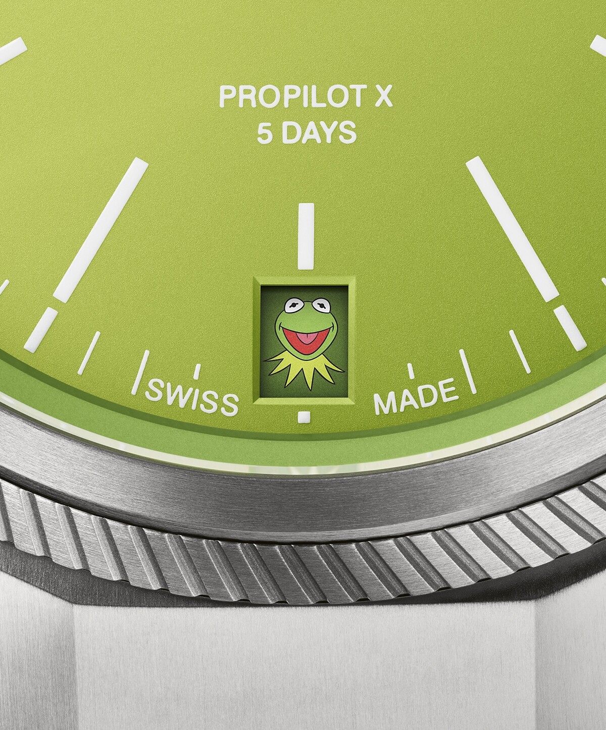 最可愛的運動錶沒有之一,Oris 找來你我兒時記憶的經典布偶劇《大青蛙劇場》(The Muppet Show)角色「科米蛙」(Kermit the Frog)跨界聯名,為經典的 ProPilot 39mm鈦合金腕錶換上亮綠色面盤,最有巧思的是六點鐘方向的日期窗,在每個月份的一號,掛上大大笑容的科米蛙圖像將會取代常規數字,用幽默玩心陪伴配戴者開啟美好一天。