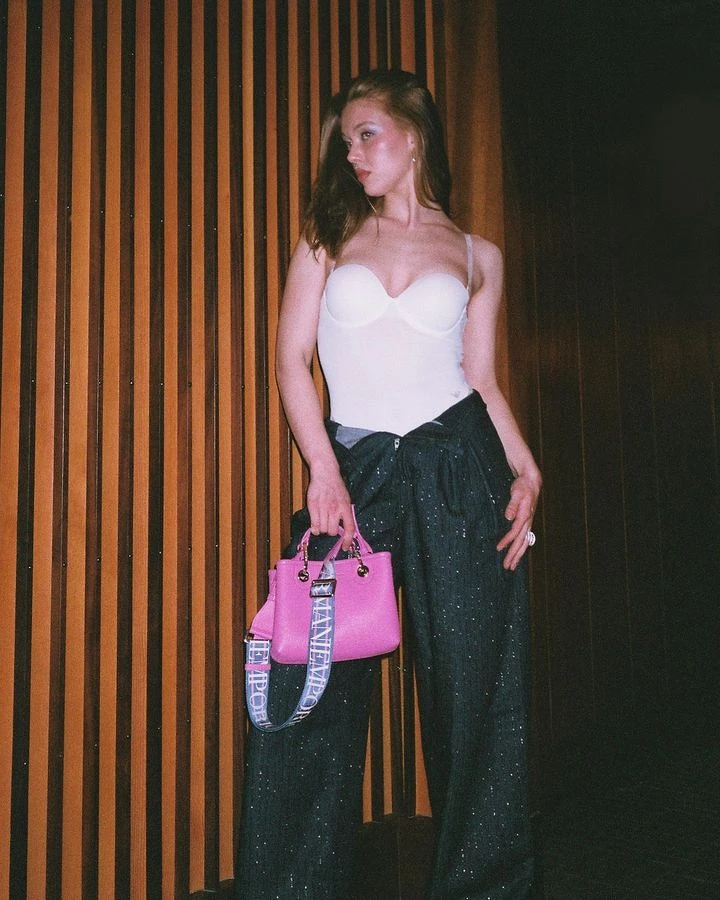 另一顆糖果色包包則是來自Emporio Armani,My EA Bag光是方正的輪廓就已不挑身型和造型,Jessica Alexander粉嫩又亮眼的芭比粉紅色,搭配她火辣的穿搭實在太美!