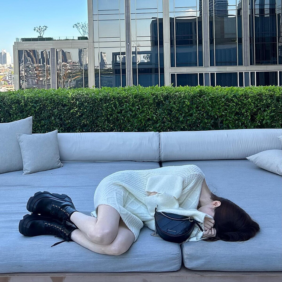 不只有拍攝廣告,韓韶禧私下也很喜歡運用CHARLES & KEITH的鞋、包,一套白色針織洋裝造型裡,她搭配的正式來自CHARLES & KEITH的半月包,黑x銀配色再次襯托她的個性氣質。