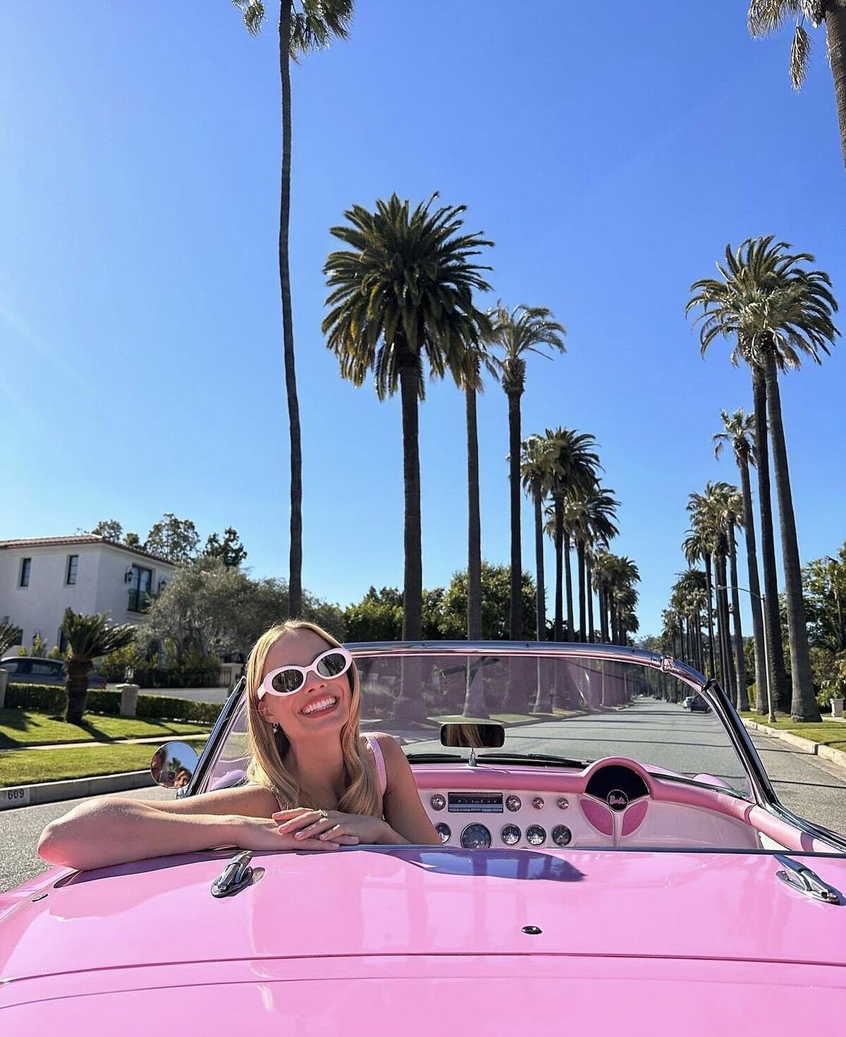 瑪格羅比穿著全身Bottega Veneta訂製的絲質百褶裙及背心胸衣套裝,與她的粉色芭比車在陽光下拍照,手上同樣是來自Bottega Veneta的粉色 Cabat手提包,亮麗造型讓這條椰林大道瞬間也變成了芭比的電影場景。