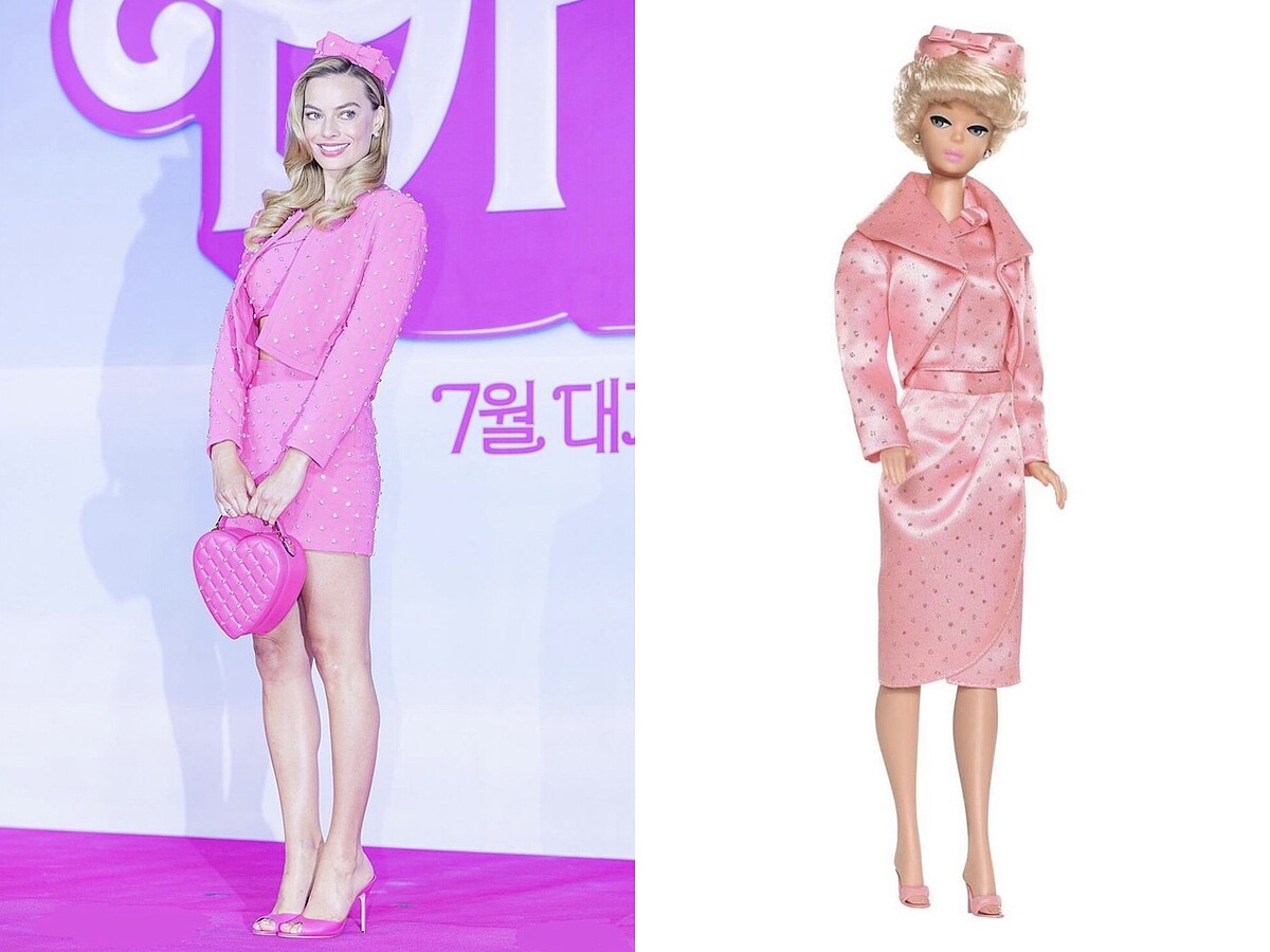 7月2日瑪格羅比來到韓國首爾宣傳,活動上一連換了兩套造型,靈感源自1985年時推出的「Day-to-Night」芭比娃娃組合。瑪格羅比先是化身「上班族芭比」,穿著粉白色搭配的西裝與窄裙,手上還拿著一只鑲滿閃亮水鑽的巨型大哥大,不只造型、連道具準備都超用心。