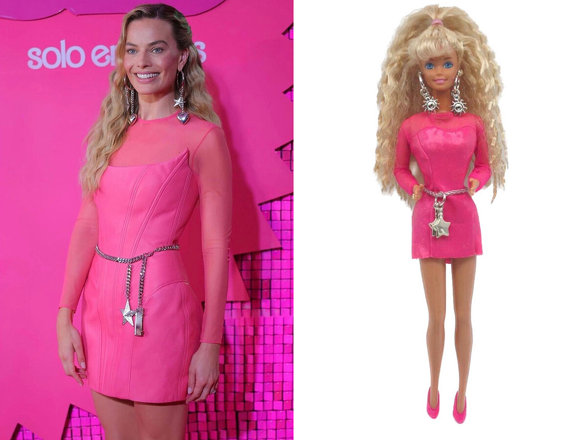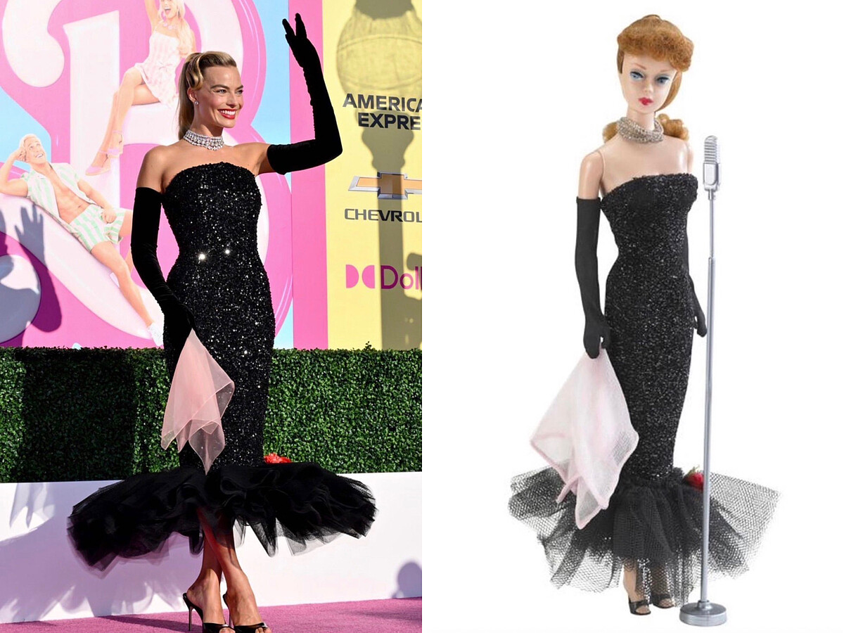 瑪格羅比於7月9日洛杉磯首映會上,復刻了1960年時所推出的「Solo In The Spotlight」芭比娃娃造型,身上的黑色魚尾裙閃爍星空光澤,是由Schiaparelli特別為她訂製的芭比裝,脖子上的份量感項鍊則是Lorraine Schwartz的珠寶,仔細看甚至連手帕都有準備!