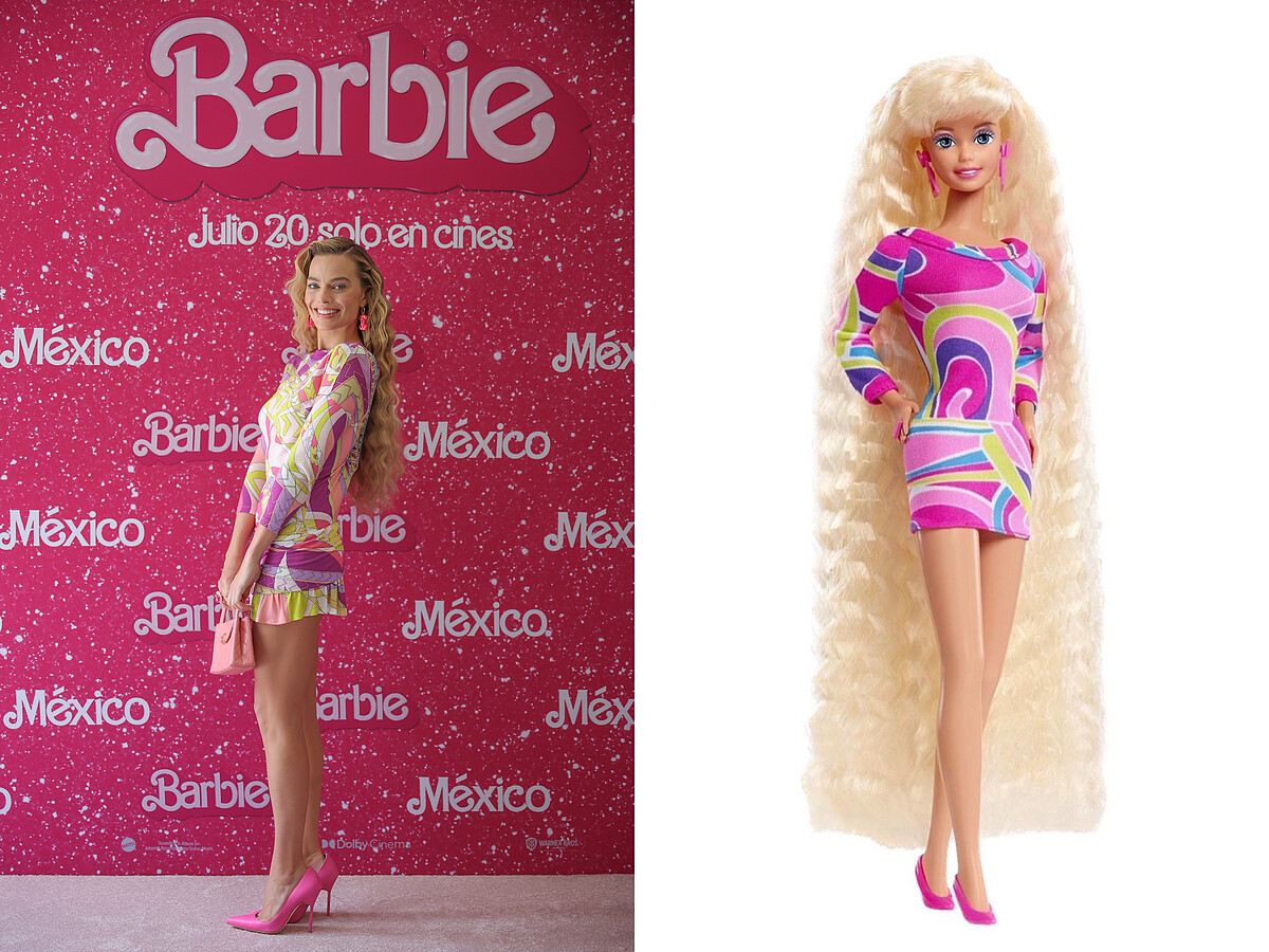 7月7日《Barbie芭比》於墨西哥舉行電影活動,瑪格羅比換上PUCCI的粉色印花的洋裝造型,手上提著CHANEL的小手提包,並燙了一頭波浪捲髮,和芭比娃娃同樣甜美浪漫。
