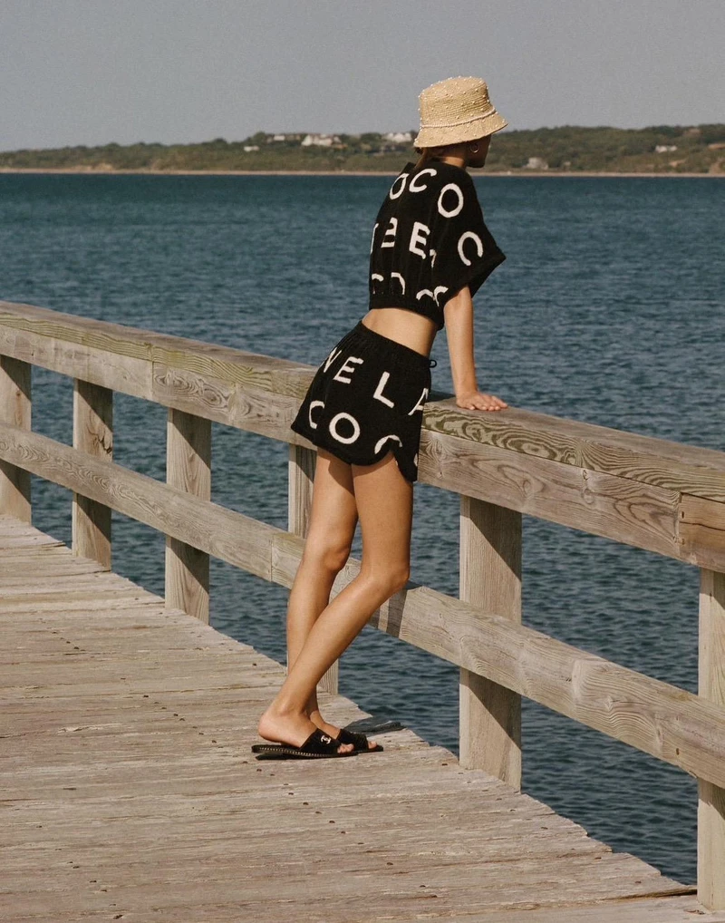 吊橋、海邊等景致彰顯 COCO BEACH 系列風格,經典的黑與白加上帶有活力的粉色調,優雅的單品輪廓結合毛巾布,呈現不造作的悠閒氣息。九○年代復古剪裁泳裝、星星符碼、斜紋軟呢短洋裝和絲絨連身褲更代表了紐約漢普頓地區的率性與文化風格。低調與奢華的巧妙揉合,打造出 COCO BEACH 系列獨一無二的度假造型面貌。