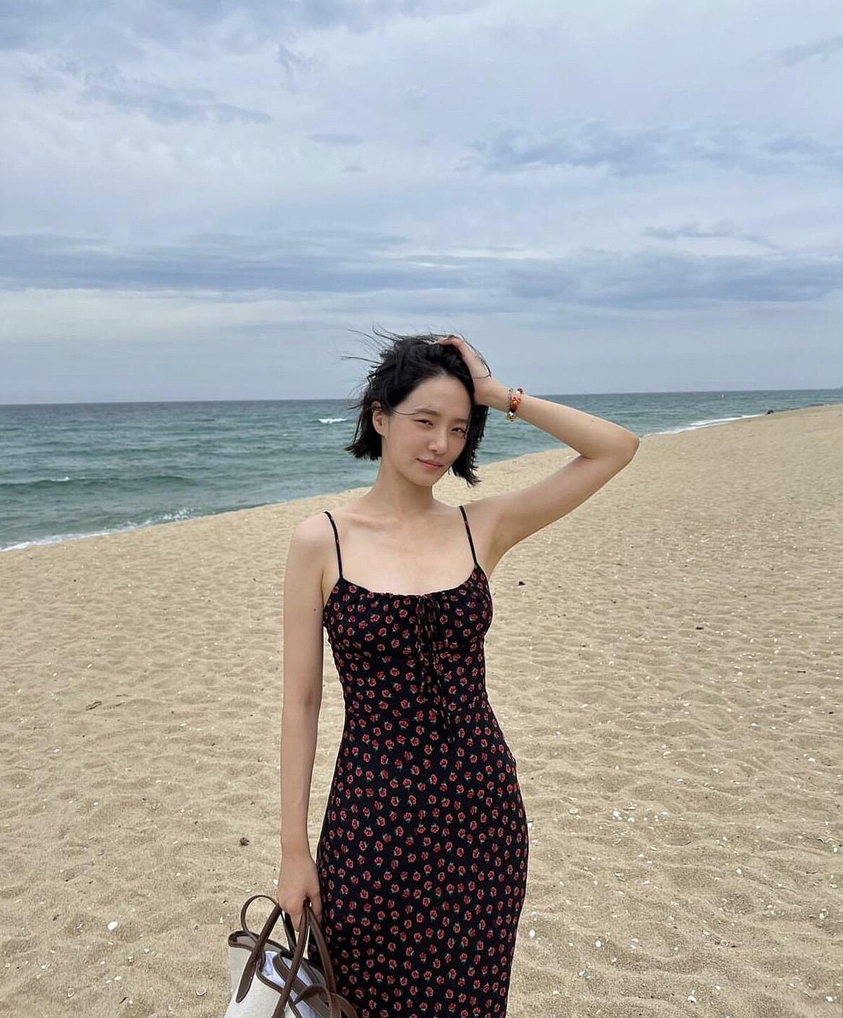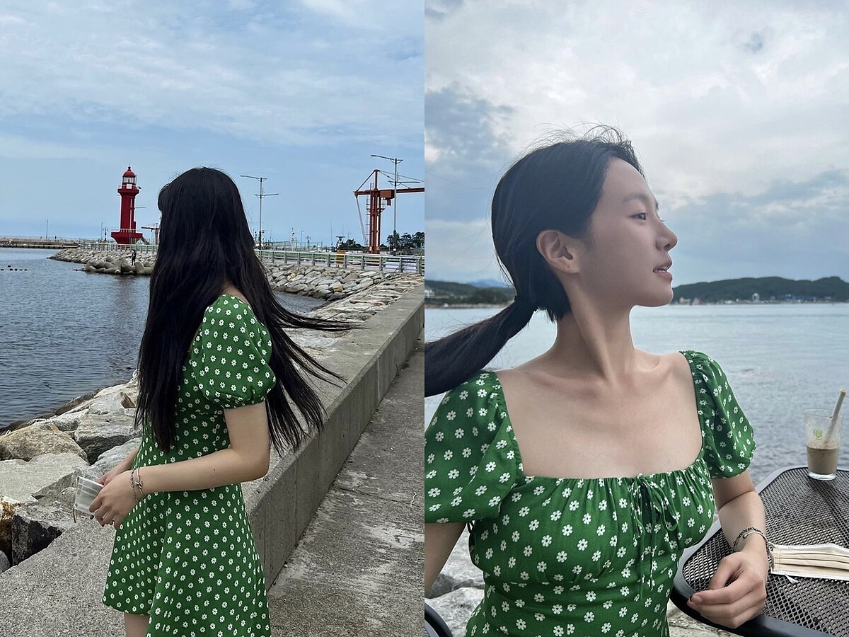 不同於《絕世網紅》中華麗造型與精緻的妝容,朴圭瑛私下經常是淡妝或素顏,所以她會選擇用溫柔色調的服裝來襯托氣色,穿上度假風碎花洋裝的她,特別甜美可人。