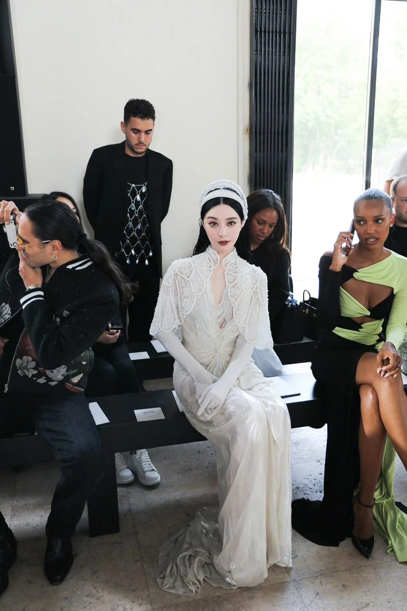 范冰冰以銀白色光澤的深V長禮服出席Tony Ward 2023秋冬高訂秀,白色手套與透明刺繡披肩、加上閃爍的髮箍頭飾,都替造型增加了優雅古典風格的完整性。