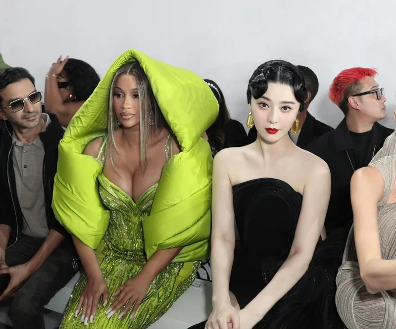 范冰冰穿著Gaurav Gupta 2023春夏季的高訂禮服觀賞大秀,禮服上皺褶的線條製作出波浪般的弧度,讓黑色禮服也能不無聊,髮型上額前圓弧的瀏海,也恰恰呼應了服裝的特色,造型很用心!秀場上范冰冰坐在Cardi B的旁邊,2位氣場衝破螢幕的東西方女帝,同框畫面可說是突破次元壁了吧!