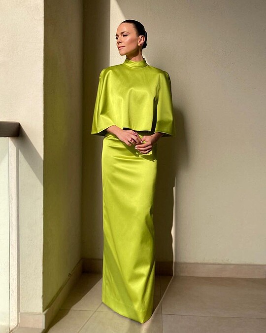 在電影拍攝地阿布達比舉行的首映會,海莉艾特沃大膽穿上一套黃綠色緞面禮服,CAROLINA HERRERA的披肩式上身設計端莊典雅,搭配上乾淨的包頭髮型,大大提升高貴氣質。